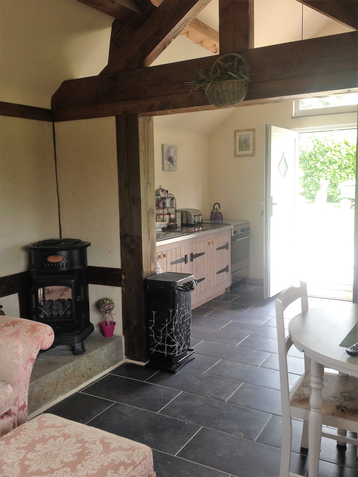 La Jeuliere Gite is in in the Calvados region of Lower Normandy, set in its own half an acre garden and surrounded by fields. This makes La Jeulière Gite the perfect peaceful country retreat. Renovated to a very high standard this former bread oven combines 18th century character and modern day luxury. offers satellite English free view TV, DVD player, log burner, conservatory and roof terrace off the bedroom which offers sun loungers and a table