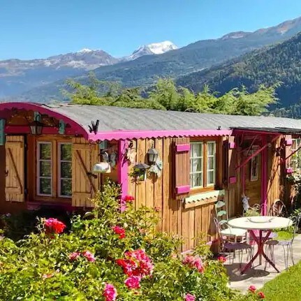 Type roulotte équipée cuisine lit double télé wifi avec sa salle de bain douche lavabo toilette Vous profiterez en plus d 'un petit chalet attenant avec terrasse abritée pour partager vos repas en exterieur avec barbecue et sans vis a vis Vue imprenable sur nos montagnes Le tout sur un bel espace verdure avec transats Cour privée pour véhicules Ménage draps serviettes compris Chien bienvenu gratuit A signaler lors de la réservation A 2 kms d'Aime La Plagne