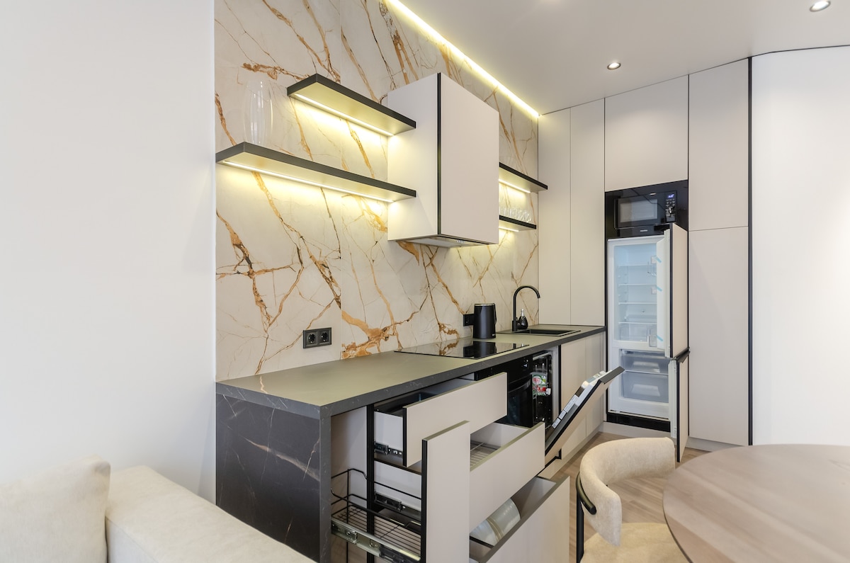 Discover minimalist peace in our designer 1-bedroom apartment in Kyiv’s heart. Space: Queen bed, Smart TV, AC & high-speed Wi-Fi. Kitchen: Fully equipped with coffee/tea. Location: New building near Universytet Metro & Shevchenko Park. Quiet, yet steps from top cafes. Perks: Private balcony, city views, and easy self check-in. ✨ Clean, serene, and perfectly located. Book your unique Japandi experience today!