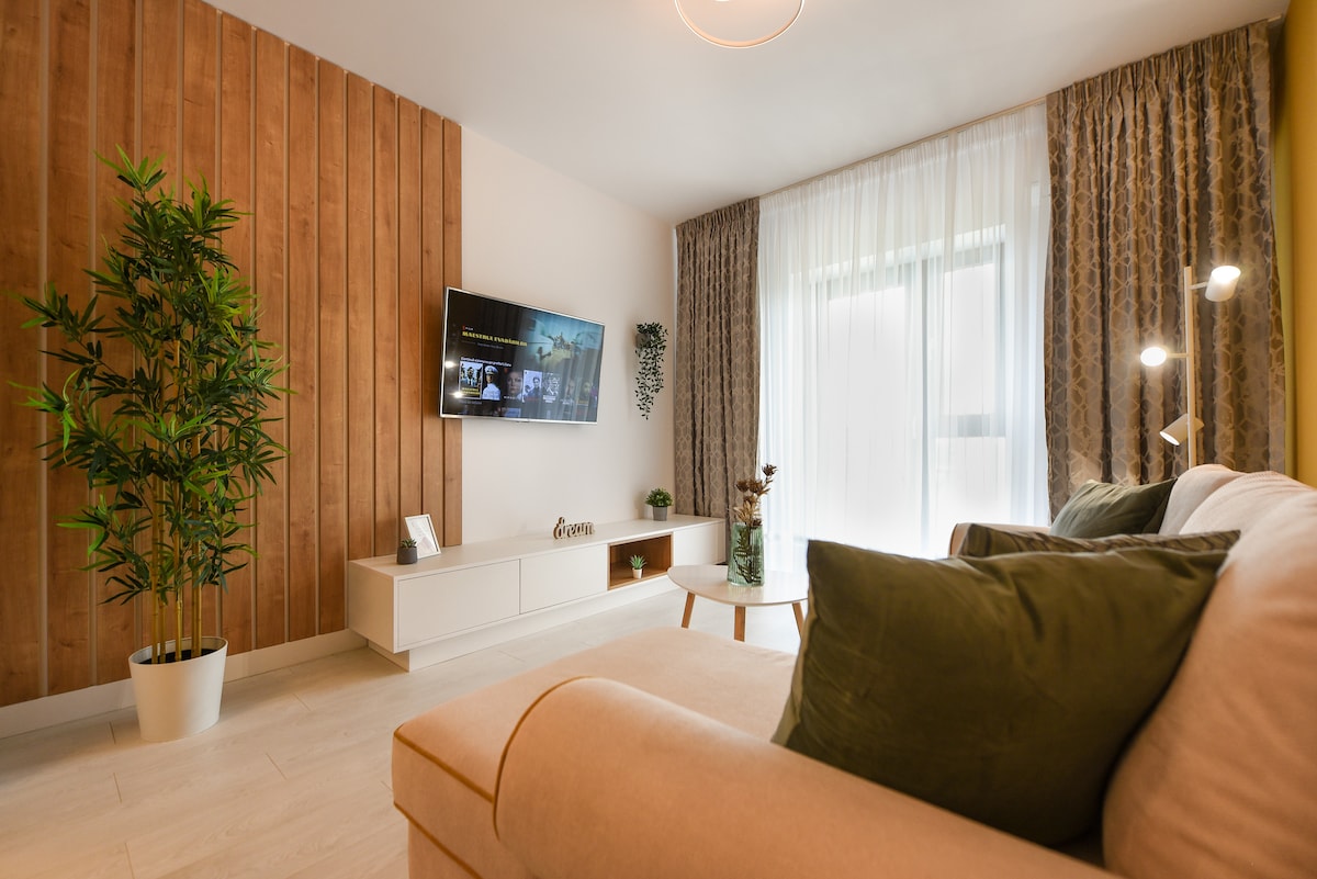 Բարի գալուստ Միդո Լումո ՝ նորաոճ և ընդարձակ բնակարան, որը նախատեսված է անխափան այցի համար ։ Երկու ննջասենյակով և երկու լոգասենյակով այս ժամանակակից հանգիստը կատարյալ է ընտանիքների, ընկերների կամ բիզնես ուղևորների համար ։ Վայելեք լիովին կահավորված խոհանոցը, հարմարավետ բնակելի տարածքը և գերարագ Wi - Fi - ը ։ Հարմարավետ ինքնուրույն ժամանում ՝ շուրջօրյա պահակային հսկողությամբ ապահով ընդունելության միջոցով ։ Համալիրն ունի 2 տեղում գործող ռեստորան, իսկ LIDL - ը և Mega Image - ը գտնվում են ընդամենը մի քանի քայլ հեռավորության վրա ՝ դարձնելով ամենօրյա հիմնական պարագաներ և հեշտությամբ հասանելի ճաշելով: