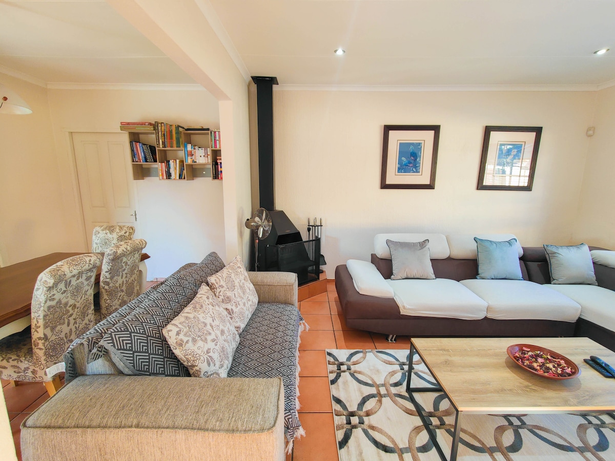 Գտնվում է անաղմուկ և ապահով վայրում ։ Ճաշասենյակ և գազօջախով լիովին կահավորված խոհանոց ։ Հարմարավետ լաունջ ՝ Smart TV - ով, Showmax/Netflix/YT - ով ։ Անվճար, արագ չբացված Wi - Fi ։ 3 վերևի ննջասենյակ ՝ յուրաքանչյուրը գրասեղանով, որը բացվում է պիժամա լաունջի վրա ։ Հիմնական ննջասենյակ ՝ երկտեղանի մահճակալով, սեփական զուգարանով, ռեակտիվ լոգասենյակով և պատշգամբով ։ Առանձին պատերով այգի ՝ մեծ աղյուսե խորովածով/բրայով և կահավորված Լապայով ։ Դռան մուտքը դեպի զբոսայգի ։ Լվացքի մեքենա, պտտվող հագուստի գիծ ։ Մեկտեղանոց ավտոտնակ ։ Հիանալի է խմբերի, ընտանիքների, երկարաժամկետ և կարճաժամկետ այցերի համար ։