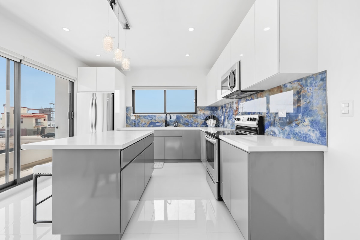 Just steps from the beach, ultimate comfort and relaxation awaits you! Gorgeous Casa Mar Bella has stunning ocean views and all the comforts of home: Modern aesthetics and appliances Custom designed bathrooms Fully equipped kitchen Cozy beds Safety and Security. Experience mesmerizing sunsets and the sound of crashing waves. Mi casa, es tu casa… sit back and enjoy! Located less than 5 mins. from Walmart, movie theater and dining; 15 min drive to downtown Rosarito; 25 min to Puerto Nuevo.