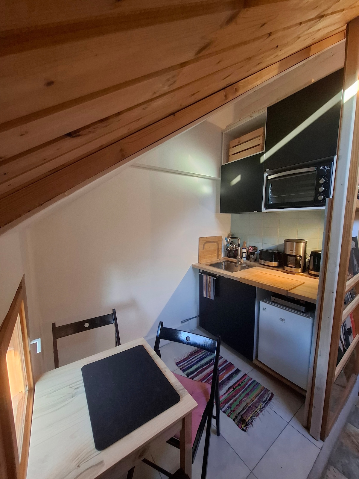 The Vinyl House is a tiny house in the Apuseni mountains accommodation, small and cozy, featuring an interior staircase. Downstairs, there's a space with a library, a wood-burning stove, and a pull-out bed (80 cm wide for one person or extended to 160 cm wide for two). Upstairs, the room features a double bed (120 cm wide) under a window offering views of the starry sky and the Cârnic massif (the window is equipped with a shade).