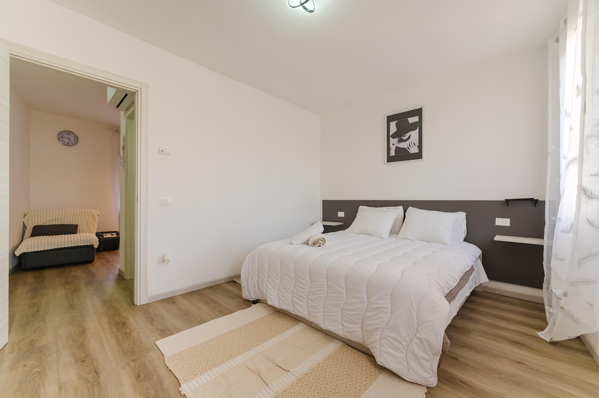 Բնակարան առանձին մուտքով, առաջին հարկ: Բաղկացած է լուսավոր հյուրասենյակից, մեծ խոհանոցից ։ Երկու ննջասենյակ, որոնցից մեկը գլխավոր ննջասենյակն է և մեկը ՝ մեկ մահճակալով, որը կարող է վերածվել երկտեղանի մահճակալի: Լոգասենյակ ցնցուղով: Նոր դեկոր: Ա կտուր. Wi - Fi (Eolo, 30 mb). Տաքացվող հատակ և օդորակիչ ՝ ջերմային պոմպով: Այգի. Ավտոկանգառ. Հինգ րոպե մեքենայով հին քաղաքի Castelfranco Veneto եւ քսան ոտքով. Գնացքով կարող եք հասնել Վենետիկ, Պադուա և Տրևիզո ։