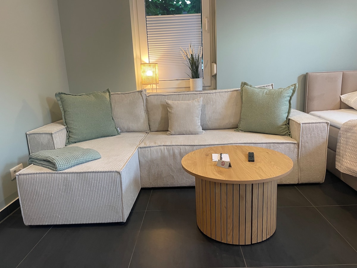 Այս ժամանակակից ստուդիայի բնակարանում կա այն ամենը, ինչ անհրաժեշտ է հանգստի համար: - Հարմարավետ 140 սմ տուփով զսպանակ - Սոֆաբեդ ։ - Խելացի հեռուստացույց ՝ Netflix - ից անվճար օգտվելու հնարավորությամբ - Ճաշասեղան - ժամանակակից ցնցուղի լոգասենյակ - Լիովին կահավորված խոհանոց ամանալվաց մեքենայով, ջեռոցով, ջեռոցով, միկրոալիքային վառարանով - Տարածքում ՝ ռեստորան և իդիլիական գարեջրի այգի Ամրագրեք հիմա և անմոռանալի հանգիստ անցկացրեք մեր բնակարանում ։