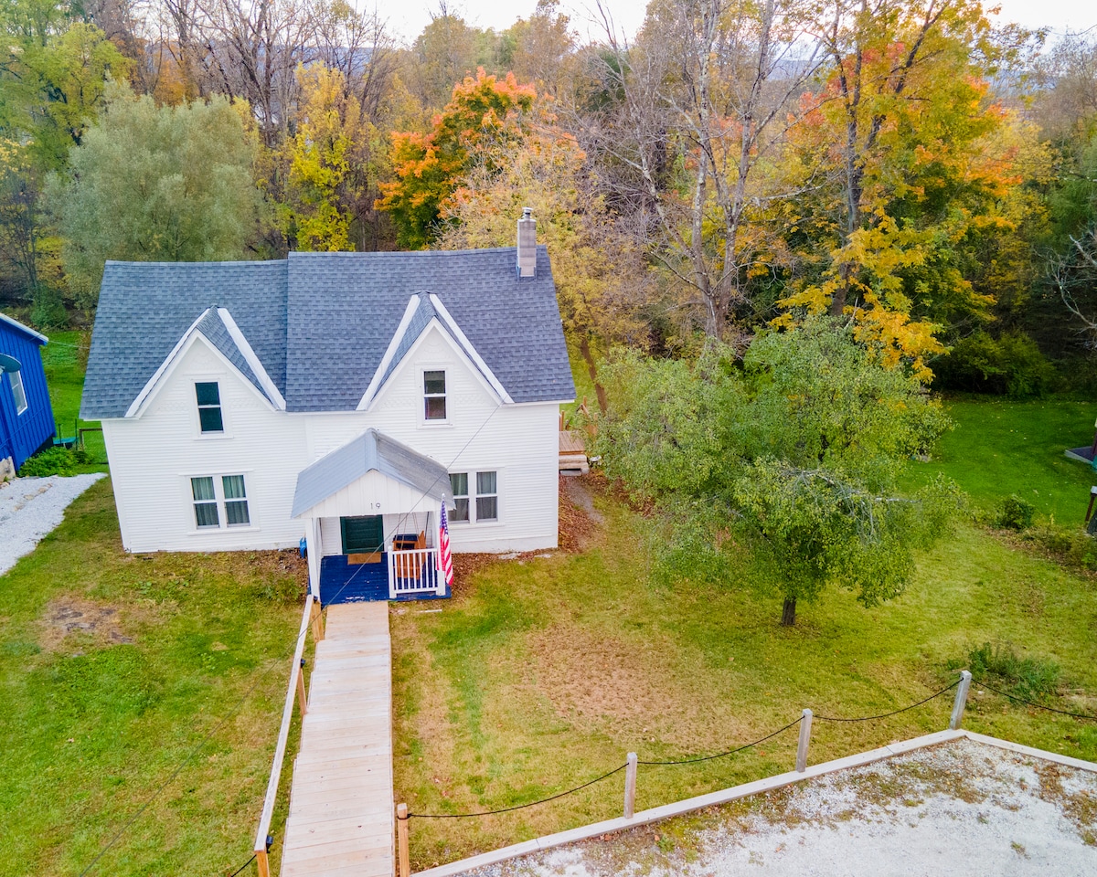Լուսավոր, մեկուսի, երկրորդ հարկի մեկ սենյակի առանձնաբաժին ՝ առանձին լոգասենյակով, որը նայում է դեպի Միլ գետը և ծածկված կամրջով ։ Ոչ մի հարևան չի երևում, բայց քաղաքի մոտակայքում ։ Թռչեք ձկները հետևի բակում, նստեք կրակարանի շուրջ, վայելեք աշնանային սաղարթը և արշավեք ու դահուկ քշեք ։ Ճոճվող կամուրջը և Ապալաչիայի երկար արահետը շատ մոտ են ։ Երեք լեռնադահուկային հանգստավայրերի մոտ ՝ Քիլինգտոն, Օկեմո և Պիկո ։ Շները ողջունելի են և սիրված, որտեղ վազելու շատ տեղ կա ։ Հարմարավետ երկտեղանի մահճակալ և բազմոց ։