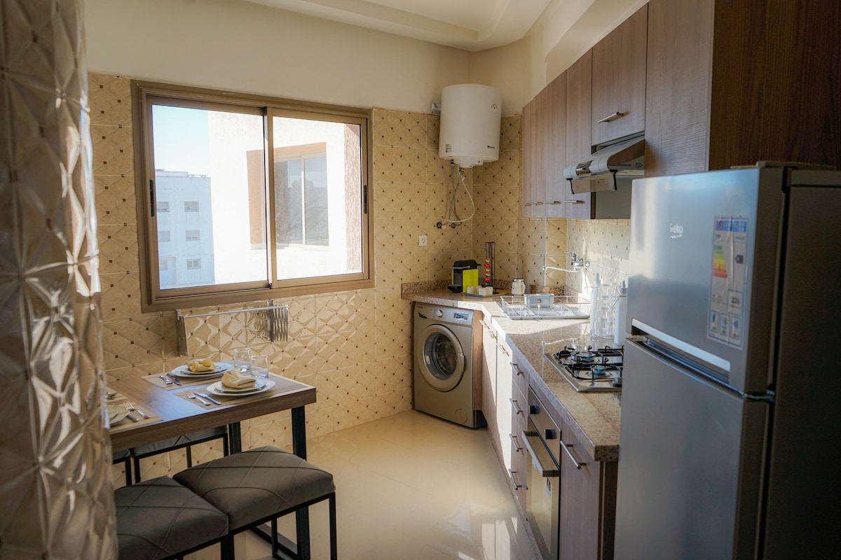 Bel Appartement lumineuse spacieux, neuf 100 m avec ascenseur en 3ème étage . Appartement au centre ville. 5 mns de la plage et Sidi bouzid. 2 mns à pied de Marjane Market.Super Cafe et Restaurant juste en face a pieds. Proches de tous les nécessaires. quartier très calme et très propre. les habitants sont tres respectables et au niveau. l'appartement dispose d'un parking sous sol privé avec des caméras de surveillance 7/7. un gardien est à votre disposition 24/24.