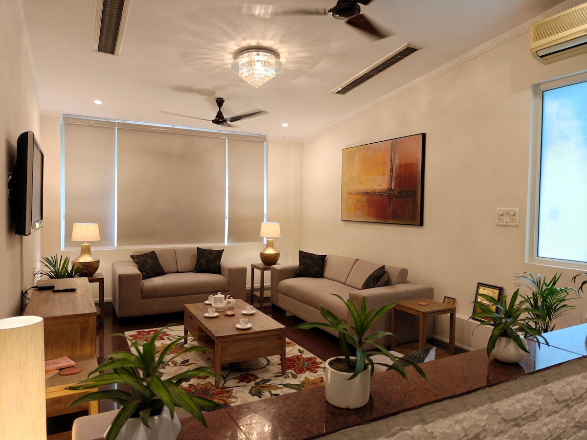 Welcome to Green View: a luxurious & sunlit, 3-bedroom, ground-floor apartment in South Delhi. Located 5 mins from Malviya Nagar Metro, PVR Anupam & Select City, DLF Avenue Malls. 3 ensuite bedrooms featuring king beds, attached bathrooms, air-conditioning, heaters, air purifiers, smart TVs, and premium linen. Relax in the spacious living room, fully equipped kitchen with elegant dining, or step out into the large park right opposite the house. A calm, green and convenient city getaway.