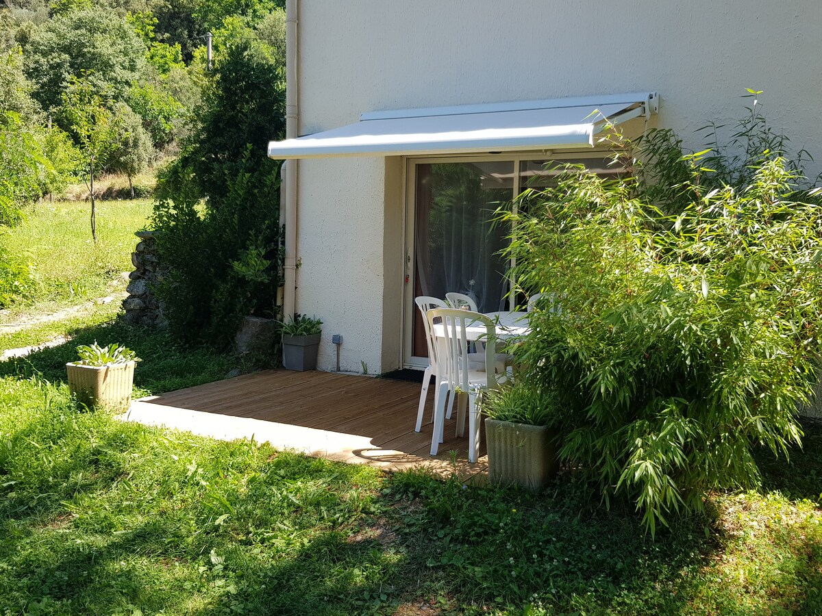 In the southern Cévennes, 1 hour from Montpellier Optional jacuzzi (35°C), please reserve 24 hours in advance. Minimum 2-day use: €55, 3 days €65, etc. Water changed weekly. All-wood living space adjoining the vegetable garden, comfortable for your relaxation, with two queen-size beds (160cm), one single bed (one on a mezzanine), and a baby cot. Kitchen, bathroom, and toilet. Shaded Terrace in Sumer, full sun in Winter. Meals available upon request (set menu). Reduced weekly
