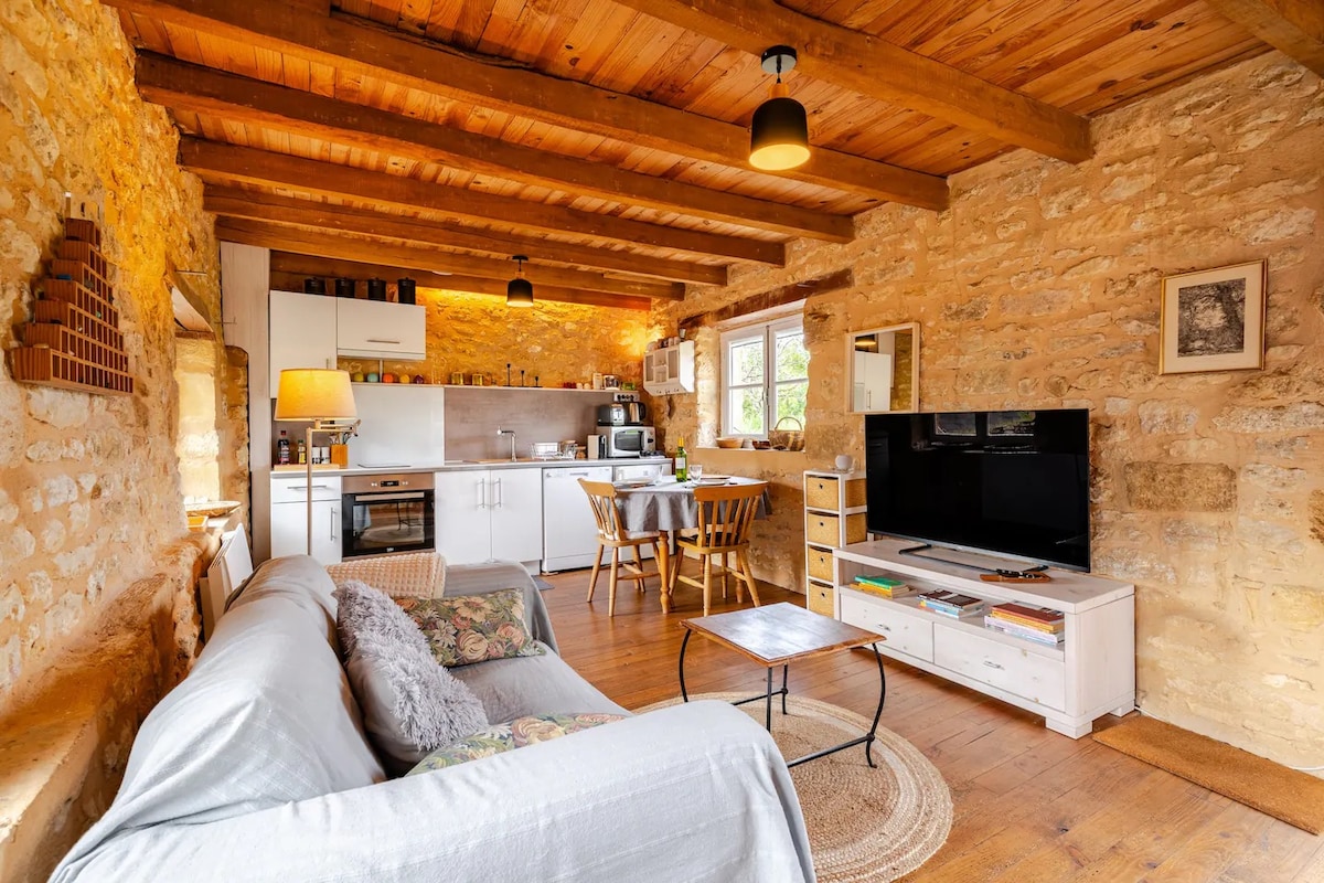 18 - րդ դարի շենք, որն առաջարկում է հմայիչ 35մ2 անկախ կացարան ՝ ամբողջովին վերանորոգված իր կտուրով ՝ առավոտյան արևի տակ սուրճ խմելու համար: Ստուդիան կազմակերպվում է խոհանոցի շուրջ, որը բացվում է դեպի կաղնեփայտե բար ՝ նստատեղով և միացված հեռուստացույցով ։ Ննջասենյակը ՝ Buletex անկողնային պարագաներով և քարե լոգասենյակով: Դուք հանգիստ վայրում կլինեք ՝ գտնվելով խանութներից և Դորդոնում լողալով մեկ կիլոմետրից պակաս հեռավորության վրա ։ Ֆրանսիայի ամենագեղեցիկ գյուղերին, դղյակներին և այգիներին մոտ ։