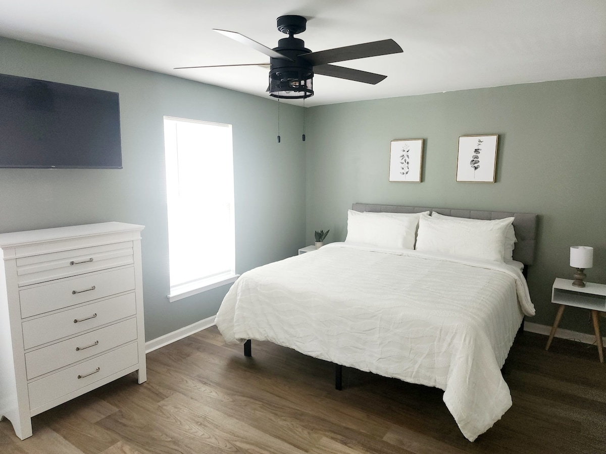 Enjoy activities (ping-pong/dart/board games), then stretch out in the king size bed. Full of host's original art. Driveway parking 10 minutes or less to all that Kennett has to offer (breweries, restaurants, Longwood Gardens, etc.), 1/2 hour to Wilmington or UD, 1 hour to Philadelphia. We live upstairs and you will hear footsteps in the morning before school and afternoons. *Solar Powered*Woman Owned*EV Charger*