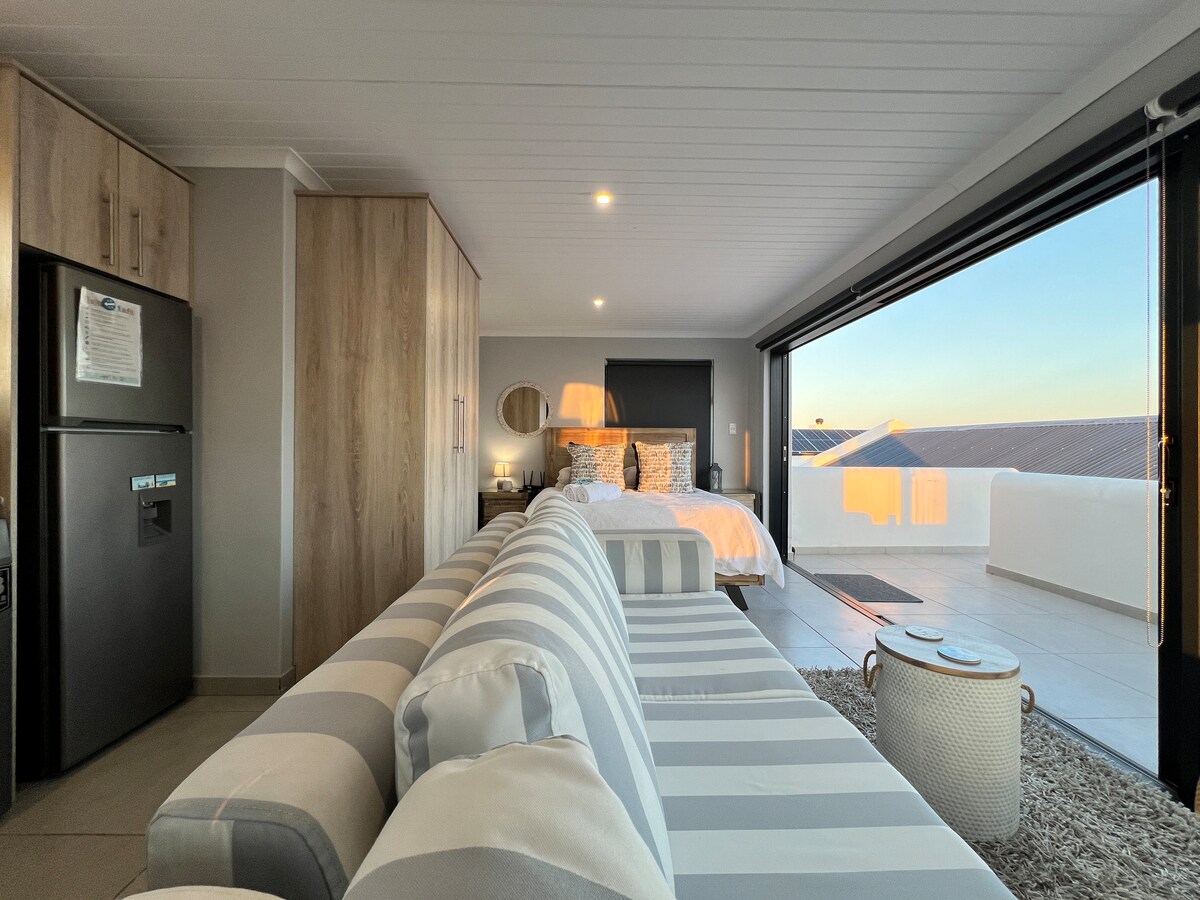 Unwind in an ocean view open-plan petite apartment (tiny and compact) on the West Coast nestled in a peaceful estate between Velddrif and Dwarskerbos, with a "Greek-style" stairway. Guests will appreciate the stunning ocean views from the balcony and morning walks on the beach. Truly a serene and relaxing breakaway. Guests can enjoy a shared swimming pool on the main property and have a separate boma in the private mini-courtyard. The beach access gate is a 1-2 minute walk from the unit.