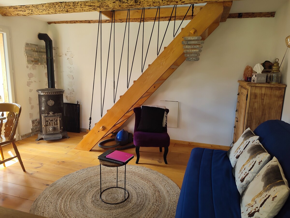 Ressourcez-vous dans ce petit nid niché en pleine nature. Attention pas d'accès direct en voiture ce qui permet le calme et la sérénité du lieu. Duplex tout équipé. Idéal pour un couple et deux enfants qui peuvent dormir ensemble. 1 lit deux places et un BZ 140. La maison a plus de 100 ans, vieux parquet à l'étage on ne peut pas y danser ;) Penser aux pantoufles. Pas d'internet ! Mais excellent réseau.