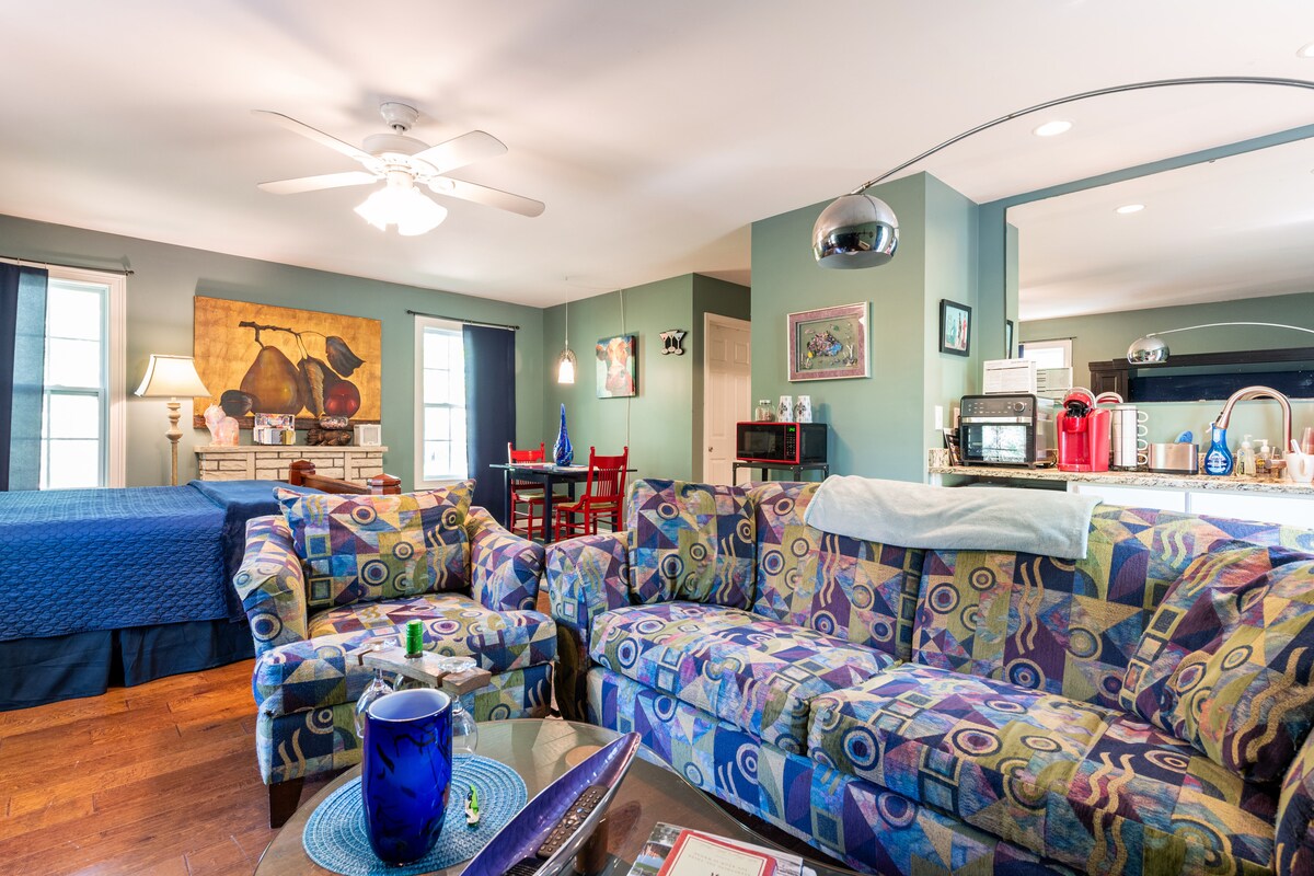 Room is a stand alone efficiency with a kitchenette, blackout curtains, and reclining queen bed. It has one designated parking space and seperate entrance. Unit has private bath and walk in closet, and kitchenete. Also has refeigerator, coffee maker, work desk microwave, 42" smart tv, Ninja airfryer oven, and couch. Private porch with table and chairs. Close/secure single parking space.