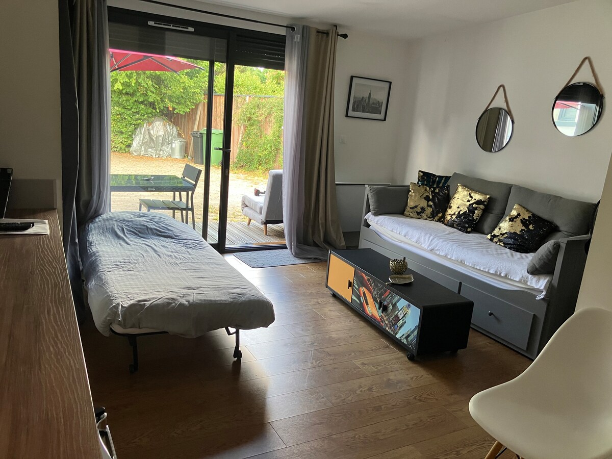 Détendez-vous au Domaine des 4 lieux dans ce nid douillet avec terrasse et jardin privatif. Cet ancien refuge pour animaux a été décoré avec beaucoup de charmes et surtout la volonté de redonner une seconde vie aux objets et aux matériaux. Vous serez séduit par sa charpente façon "yourte", sa grande luminosité, la chaleur de son poêle, sa salle d'eau élégante et son écrin de nature. Déconnectez le temps d’un week-end ou lors de vos déplacements professionnels (installation wifi en cours).
