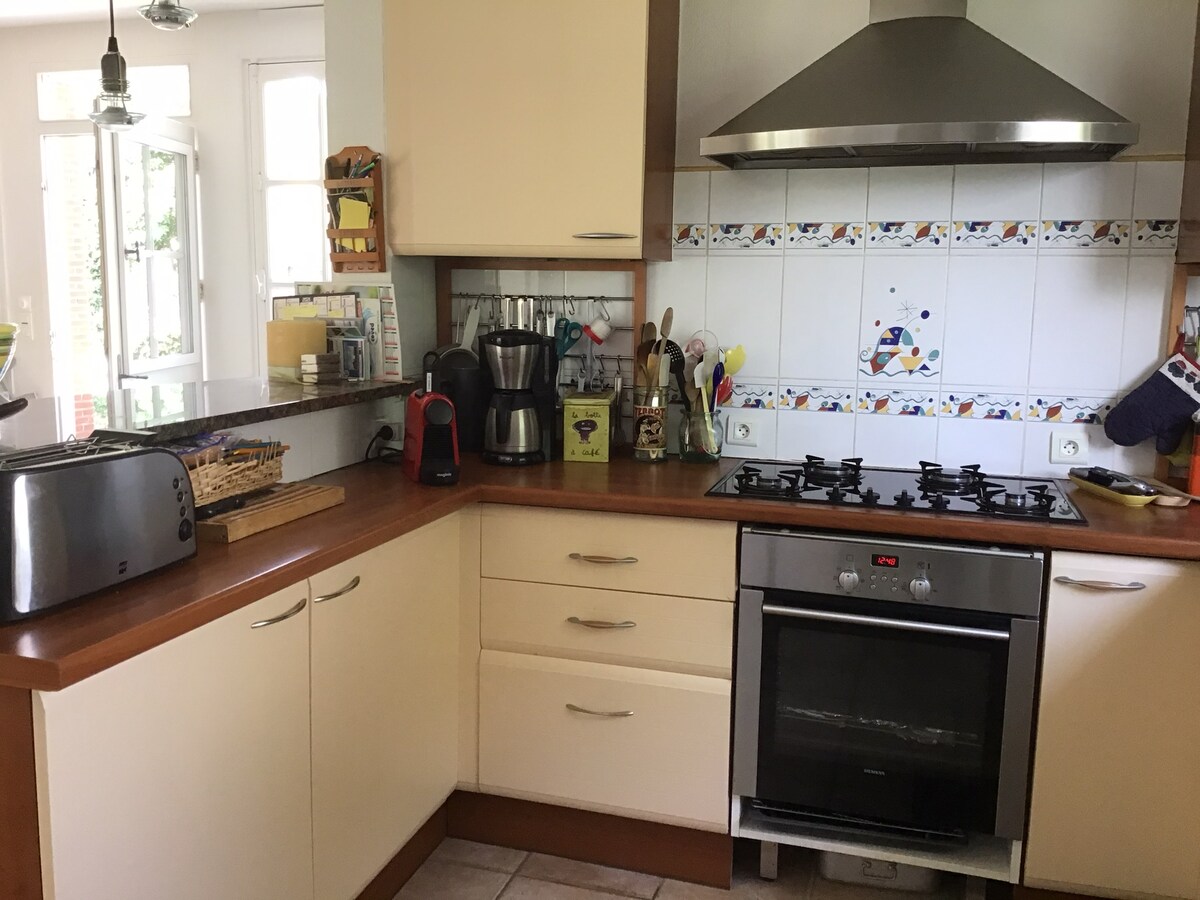Que vous veniez en train, en bus, en voiture... un havre de paix vous attend ! Maison dans le bourg de Ste Marie avec jardin, à 100 m. des commerces, 300 m. des plages, Très lumineuse, chauffage au sol et poêle à bois en agrément. Literie de qualité en mezzanine. 2 vélos à votre disposition. Local sécurisé pour vos propres vélos. Jardin de charme, sans vis à vis, hamac, chaises longues, terrasse et balcon pour déjeuner. Forfait ménage non compris, possibilité de réserver sur place.