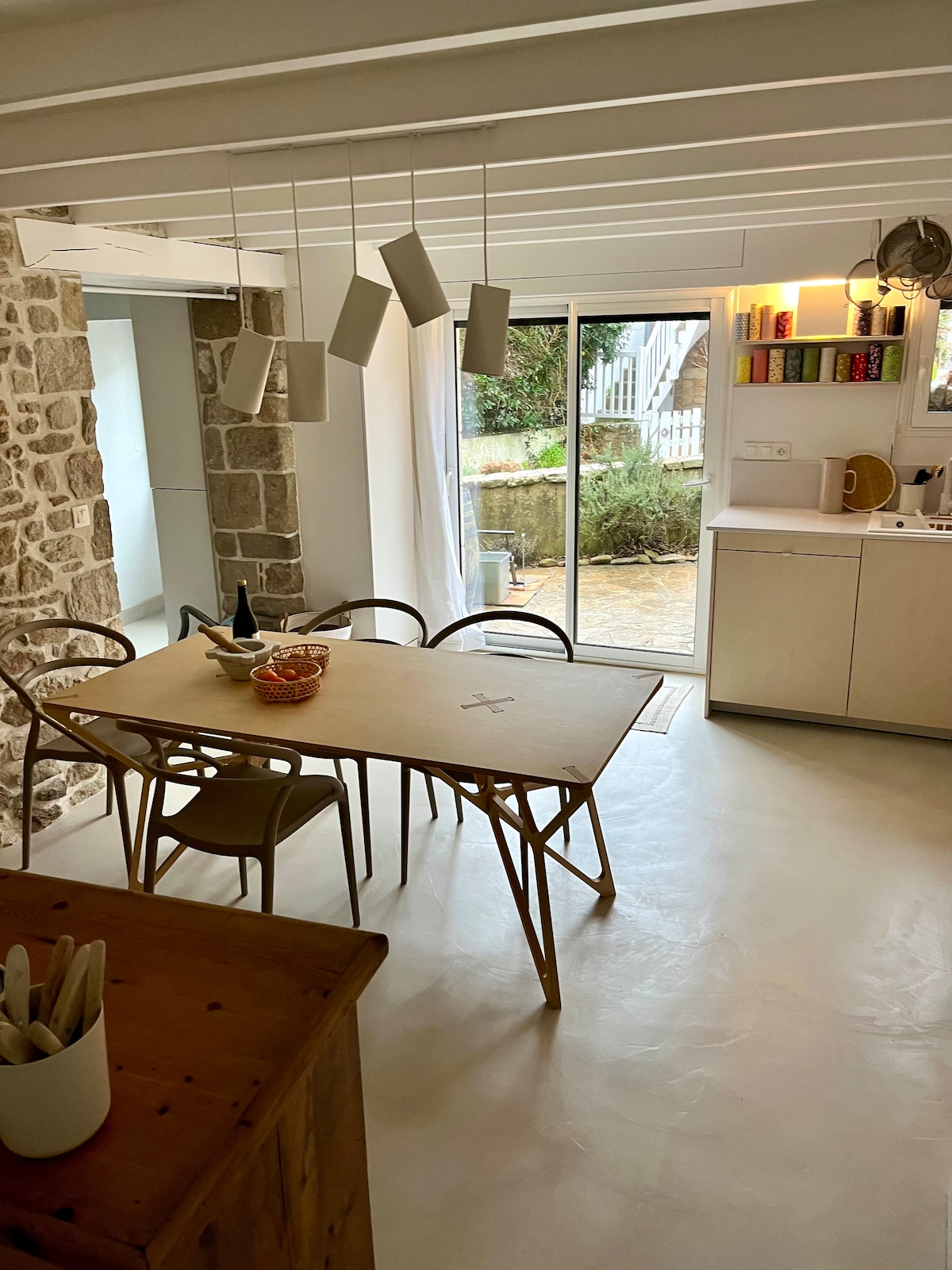 Maison refaite à neuf fin 2024. Toujours propre. Maison de pêcheur/cour-jardin /ruelle interdite aux voitures non riverains / 2 min plages et port de Portivy. 3 chambres lits doubles neufs made in France écologiques (2022) et une chambre avec deux lits écologiques (2021) solidaires. 2 wc. 2 salles d'eau: bain à l'étage et douche au sol. Cheminée : bois non compris. Cuisine neuve fin 2024: ustensiles, vaisselle qualité. Bbq. Machine café grain. Linge prêté selon saison. Wifi. Pas de fête permise