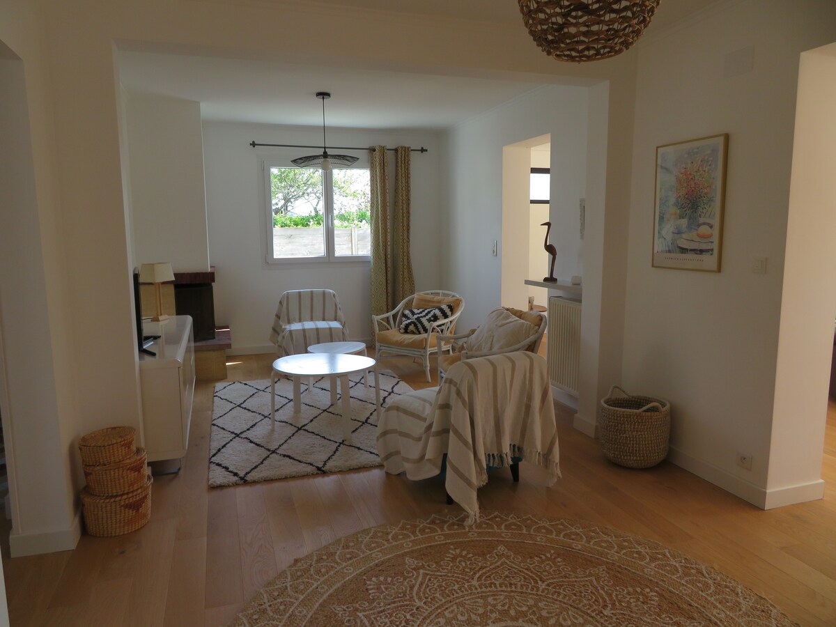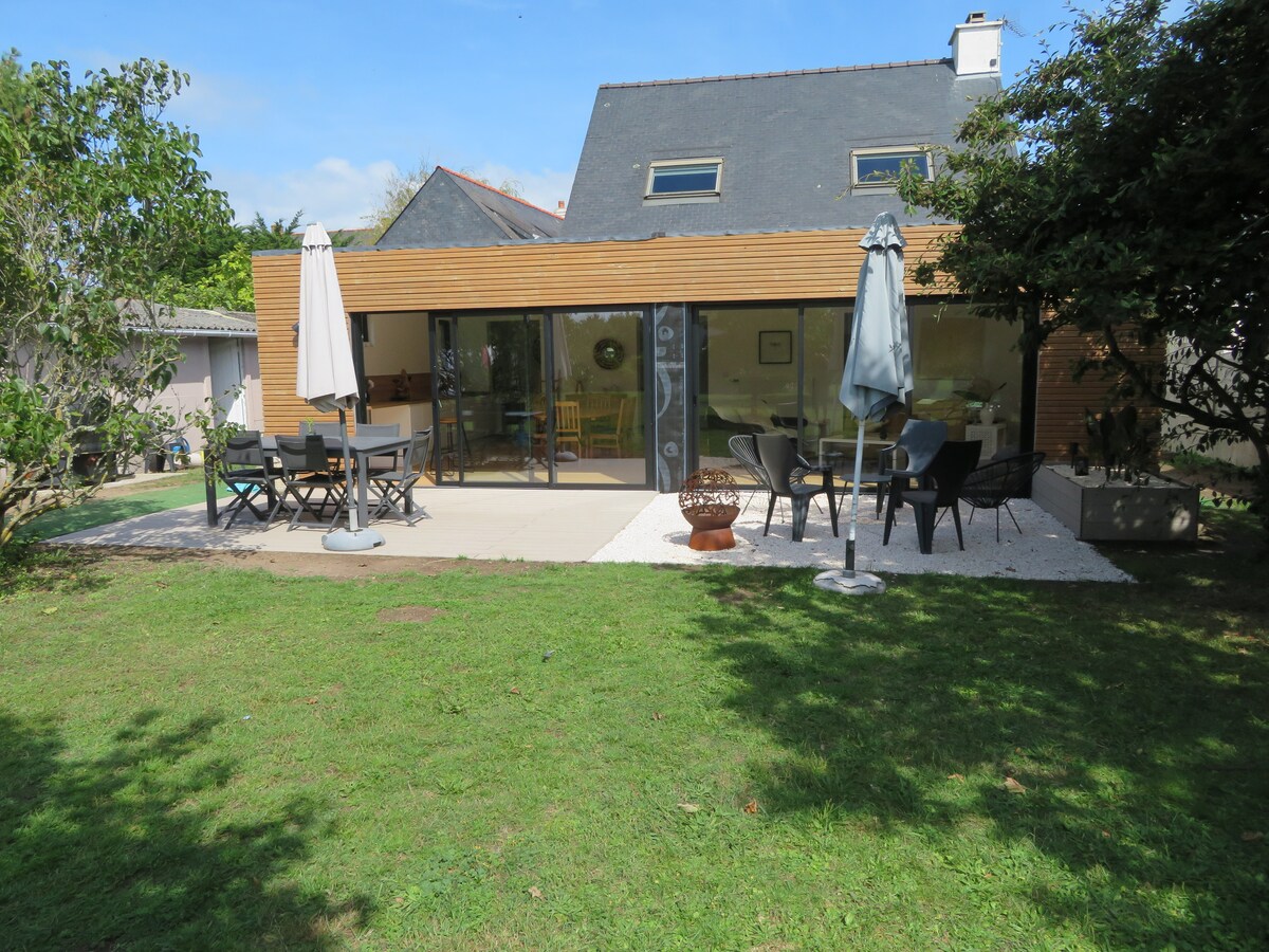Venez découvrir notre maison de vacances idéale, été comme hiver, pour les familles ou les amis en quête d'une retraite en bord de mer. 7 couchages, 3 chambres, 2 salles de bain. Grande pièce à vivre de 50 m2 baignée de lumière par 2 baies vitrées donnant sur un jardin arboré et une terrasse exposée plein sud. 2 couchages supplémentaires en option dans un studio indépendant. Emplacement idéal au cœur de la presqu'île, à 5 min à pied des commerces et de la mer, à 10 min de la côte sauvage.