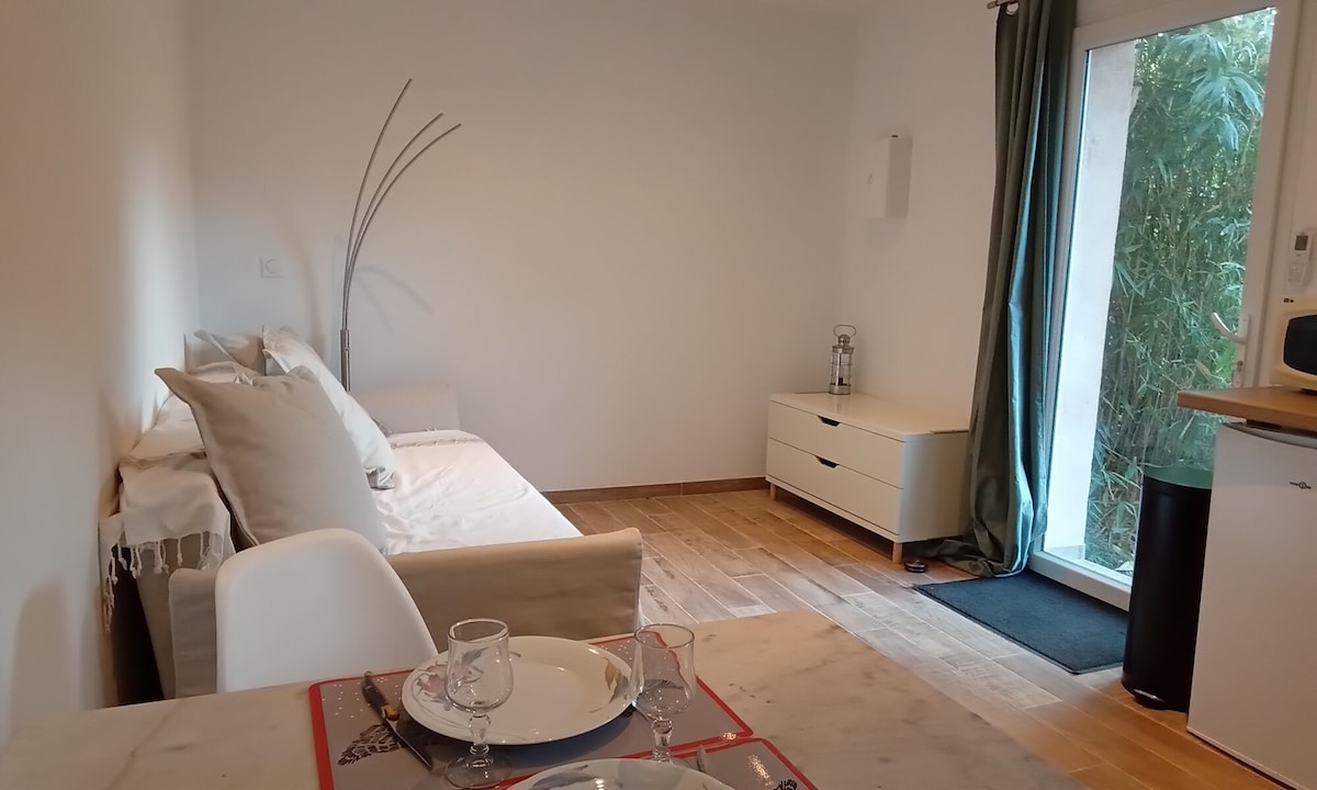 (ԽՆԴՐՈՒՄ ԵՆՔ ԿԱՐԴԱԼ ՆԿԱՐԱԳՐՈՒԹՅՈՒՆԸ ՄԻՆՉԵՒ ՎԵՐՋ ՝ ՆԱԽՔԱՆ ՈՐԵՒԷ ՀԱՅՏԸ) Ողջույն, մենք ողջունում ենք ձեզ Cadolive, Provencal գյուղում, որը գտնվում է Massif de l'Étoile - ում ։ 35 ք/մ մակերեսով բավականին գեղեցիկ ստուդիան ԿՑՎԱԾ Է ՄԵՐ ՏԱՆ ՆԵՐՔԵՒՈՒՄ ։ Մուտք գործեք փոքր վերանդայով և անմիջապես մուտք գործեք նստատեղ/դոդո բազմոցի տարածք ։ Ննջասենյակի տարածքը առանձնացված է վարագույրով: Ցնցուղասենյակ ՝ ցնցուղով և զուգարանով ։ Մուտք դեպի լողավազան և հանգստացնող այգի, որոնք գտնվում են մեր վիլլայի դիմաց + առանձին այգի հենց ձեզ համար ։