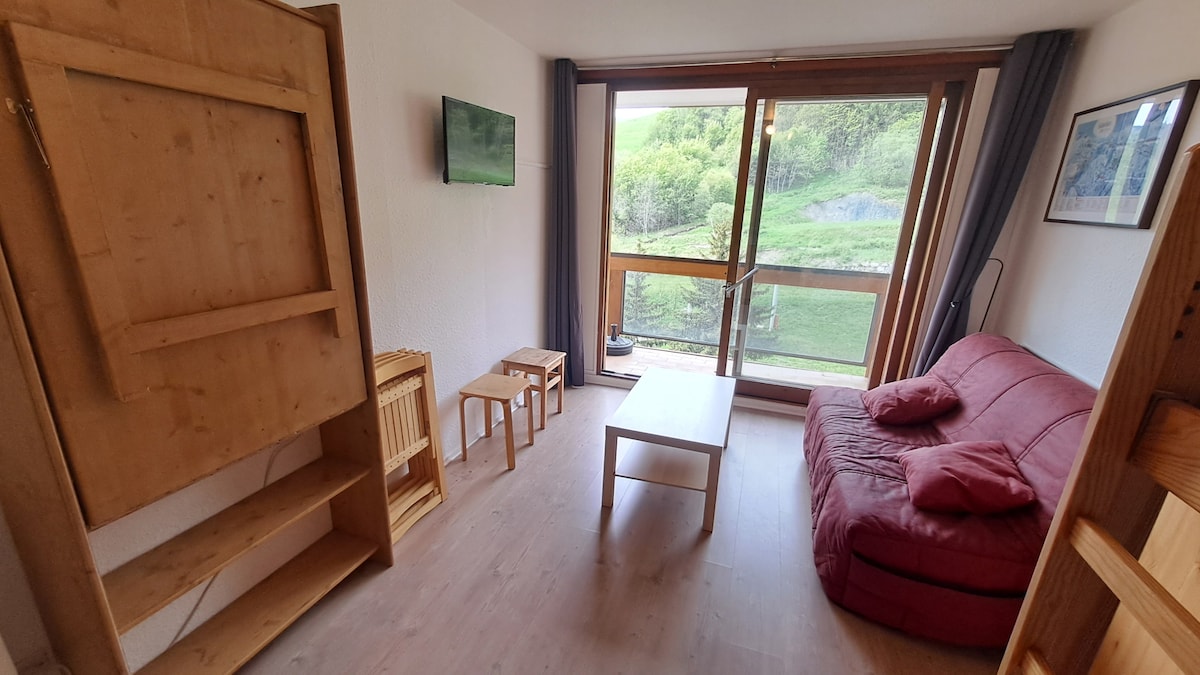 Studio pour 4 au 9e étage de l'immeuble Soyouz-Vanguard Profitez de ce logement au pied des pistes du domaine des Sybelles (Plus de 300km de pistes) avec casier a ski privé, balcon avec superbe vue sur la vallée. Logement équipé de cuisine, 2 lits superposés, canapé convertible, salle de bain, volets roulants électriques et d'espaces de rangements. Accès à tous les commerces, piscine, bars, restos dans la galerie. Idéal pour ski, rando, VTT en famille ou entre amis! Caution ménage demandée.
