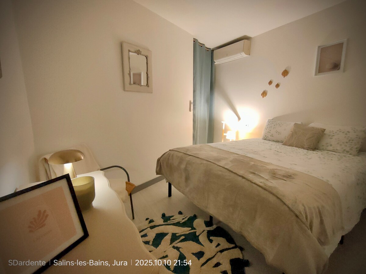 F2 (2 pers) 54m² Cuisine équipée ouverte/salle à manger salon. Salle d'eau, wc séparé. Chambre lit 180/200 + Placard, Commode. Linge fournis. Lire le règlement intérieur. Attention Appart déconseillé aux personnes à mobilité difficile Au 1er accès par escalier en colimaçon Ville thermale (Eau salée naturelle : piscine, jacuzzi, hammam, sauna...), Les Salines classées à L'U.N.E.S.C.O Activités : parapente, deltaplane, randonnées, circuits VTT, nombreux sites à voir dans le Jura ou le Doubs.