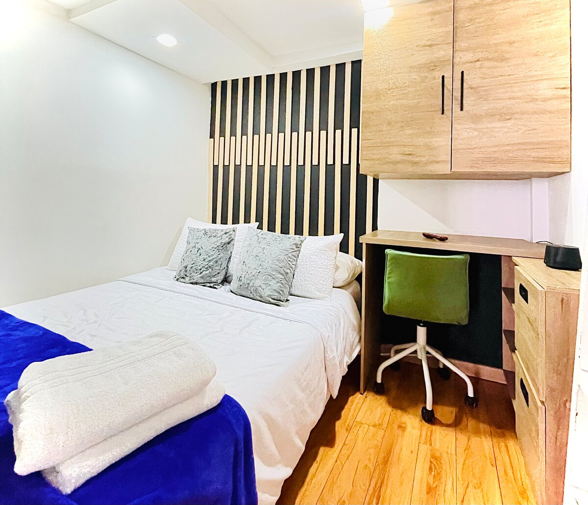 Ապարտաեստուդիո ՝ նոր կահավորված և կահավորված տեռասով, սմարթ ափսե ՝ ավելի մեծ անվտանգության համար, շուրջօրյա հսկողություն, հեռուստատեսություն ՝ հոսքային հարթակներով և ալիքներով, Wi - Fi; Գտնվում է Չապիներոյում ՝ Բոգոտա քաղաքի ռազմավարական տարածքում, որտեղ կգտնեք մոտակա առևտրի կենտրոններ, քաղաքի լավագույն ռեստորաններն ու բարերը Խորհուրդ. ամրագրման պահին կպահանջվի անձը հաստատող փաստաթղթի լուսանկար ՝ շենք մուտք գործելու թույլտվությունը կատարելու համար, ինչպես պահանջում է ադմինիստրացիան ։
