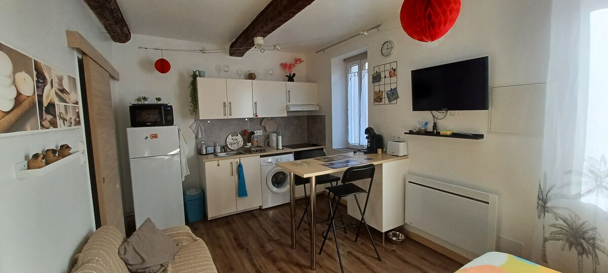 studio lumineux au calme en centre ville au premier étage sans ascenceur il est composé d un coin cuisine équipée d un frigo congelateur , un micro onde ,un four et une plaque vitricéramique un lave linge,une cafetière tassimo , un grille pain , une bouilloire ,avec une table haute et ses 2 chaises un coin nuit avec lit en 140 ( neuf ) a l entrée une grande armoire avec penderie et étagère une télé et un canapé deux places une salle d eau avec wc douche et vasque sur meuble