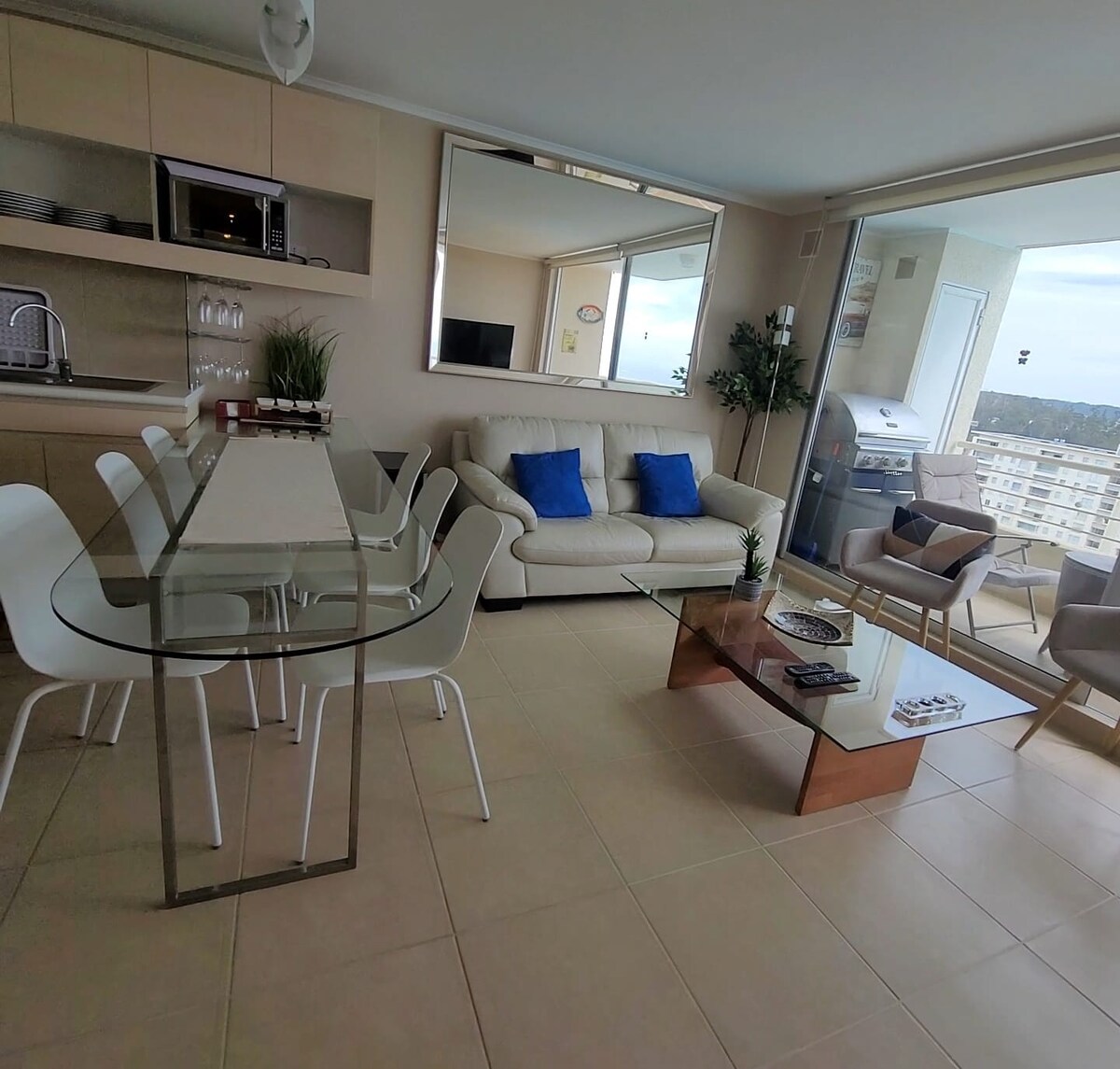 Hermoso departamento en condominio Laguna Bahía en un entorno seguro, Laguna navegable y playa artificial, 2 piscinas, parrilla, jacuzzi, Food Truck, canchas de tenis, gimnasio, varias canchas, cuenta con 10 hectáreas para hacer largas caminatas. Hermosa vista despejada al mar y al valle, estacionamiento propio y de visitas, wifi, 2 Smart TV, Netflix, Max, Zapping, full equipado, sólo debe llevar sábanas y toallas. Súper Anfitrión con más de 100 reseñas!!!