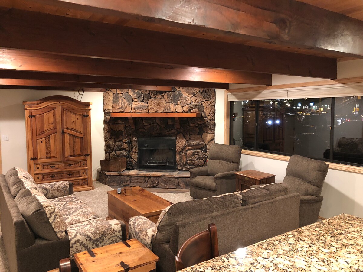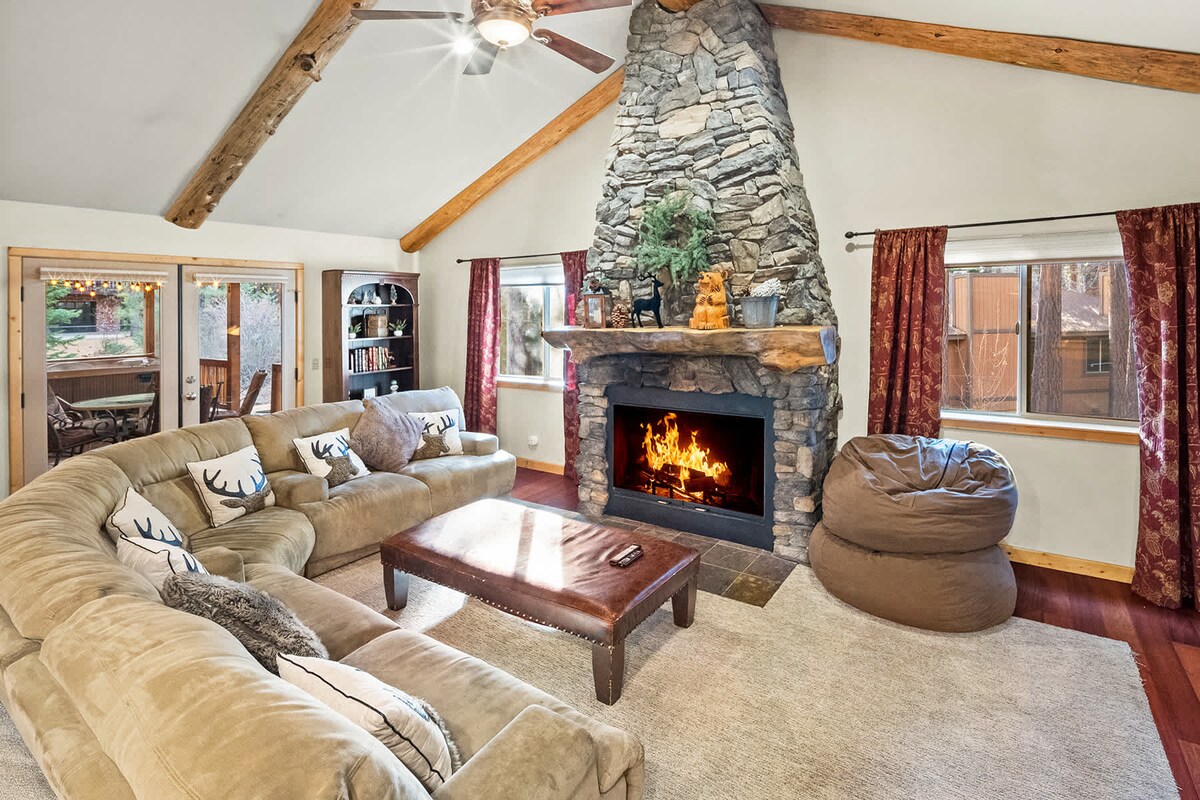Rancho Pines - ը դասական եռանկյունաձև տուն է ՝ ժամանակակից ուղեվարձի և գյուղական հմայքի թարմ հավասարակշռությամբ: Կենտրոնում գտնվում է ընդամենը 1.2 մղոն հեռավորության վրա գյուղից եւ Snow Summit լեռնադահուկային հանգստավայր է հանգիստ cul - de - sac հենց այնտեղ, որտեղ դուք ցանկանում եք լինել. Վերանորոգված խոհանոց, լոգասենյակներ գետի բնական ժայռերի հատակի վրա ։ Դուրս եկեք 280 աստիճան տախտակամածի վրա, որը լի է խորովածով, նստած տարածքներով և առանձին ջակուզիով ։ (Առանց տնային կենդանիների) Ես ունեմ արտաքին տեսախցիկ, որը վերահսկում է մերձատար ճանապարհը ՝ անվտանգության նկատառումներով