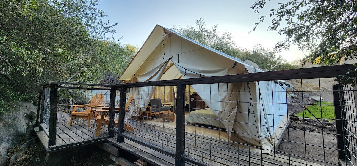 Բարի գալուստ ձեր մասնավոր գլեմփինգային վրանը Պալոմար լեռան վրա: 67 հեկտար մակերեսով ռանչոյի վրա գտնվող այս ընդարձակ զանգի վրանը ներառում է երկտեղանի մահճակալ և երկտեղանի բազմոց ՝ կատարյալ զույգերի, ընտանիքների կամ ընկերների համար ։ Շրջապատված կաղնու ծառերով, աստղալից երկնքով և լեռնային օդով ՝ դուք կվայելեք հարմարավետությունն ու բնությունը ։ Իսկական «հավաքեք, հավաքեք» արկած ՝ խոհարարական սպասքով, գազօջախով և պրոպանե տաքացուցիչով մեր պատրաստի քեմփինգային փաթեթին անցնելու տարբերակով ։ Ճամբարի հյուրընկալողը հասանելի է 24 ժամվա ընթացքում ։