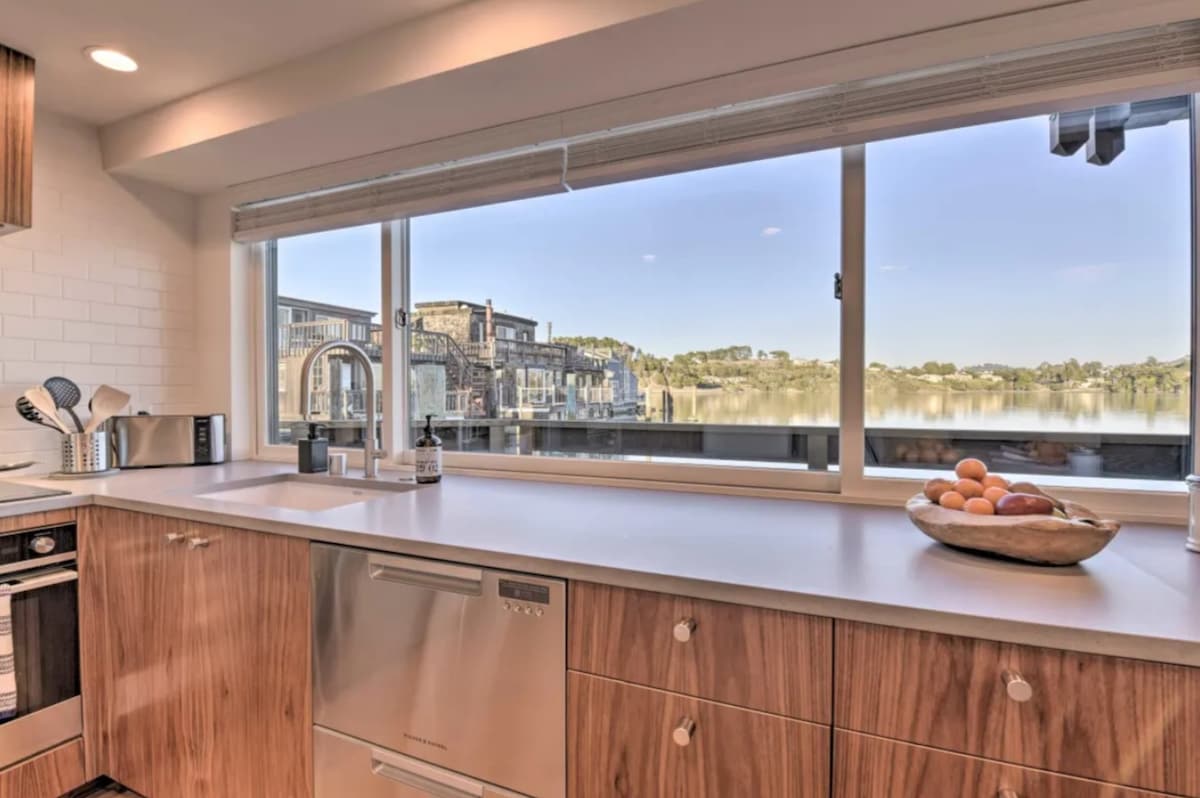 Romantic floating condo with breathtaking water views. Relax & enjoy a tranquil escape in style and comfort. Catch the sunrise from your super comfie KING bed or lounge on the deck with occasional pelicans (or even a seaplane) coming and going. Unique and perfect for a getaway, workacation, or retreat. Golden Gate Bridge is 6 min away. Airport bus stops a block away. Walk/bike path to Sausalito & Mill Valley. Ferry/bus to SF. Free parking Read reviews of this or our 3 other floating condos!