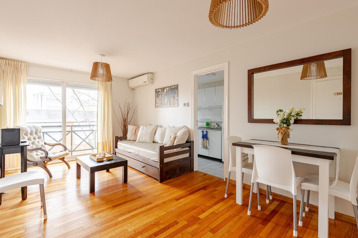 Super practical with good sunlight all day. Downtown (50 meters from the train station and 300 meters from the main avenue with more than 10 bus options). PRIVATE PARKING INCLUDED. 1 bedroom with double bed, full bathroom. Full amenities: Air conditioning in both rooms, TV with Chromecast, Wi-Fi, Washing machine, Microwave, Toaster, Coffee maker and Iron. Fully equipped kitchen elements and tableware.