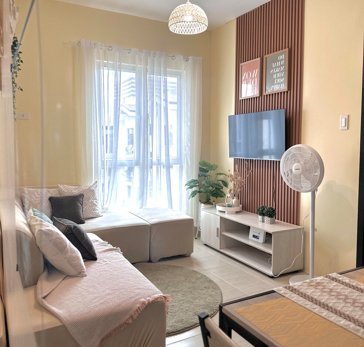 Այս ընդարձակ և հարմարավետ 1 ննջասենյակը նախատեսված է ձեր առավելագույն հարմարավետության և հանգստի համար: Զգացեք հմայքը մեր հարմարավետ հարկաբաժնում ։ Ձեր տունը ՝ տնից հեռու ։ - Հյուրերի հիգիենիկ պարագաների և հիգիենայի պարագաների անվճար պարագաներ - Ամբողջական խոհանոցային և ճաշասենյակային պարագաներ - Կարող եք խոհարարությամբ զբաղվել ։ Գտնվելու վայրը ՝ Փալմրիջ Թաուեր, Ռոչեսթեր Գարդեն, Սան Խոակին, Պասիգ - 5 -10 րոպե մինչև SM Aura, BGC և Market2x - Ոտքով հեռավորություն դեպի բոլոր հաստատությունները - 15 -20 րոպե մինչև Մանիլայի միջազգային օդանավակայան Լողավազանի հասանելիություն 200/գլուխ