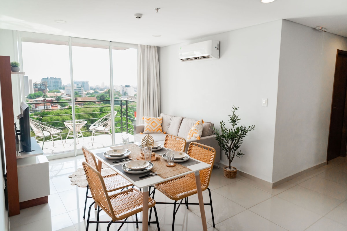 Այս ժամանակակից 1 ննջասենյակով բնակարանը Ասունսյոնի սրտում, որը գտնվում է կորպորատիվ առանցքի վրա գտնվող Shopping del Sol - ից ընդամենը 50 մետր հեռավորության վրա, կատարյալ վայր է նրանց համար, ովքեր փնտրում են հարմարավետություն, ոճ և անմոռանալի վայր: Ննջում է մինչև 4 հյուր ՝ այս տարածքը նախատեսված է ձեզ յուրահատուկ փորձառություն առաջարկելու համար ՝ լինի դա բիզնեսի, թե հաճույքի համար ։ Այն նախատեսված է ձեզ համար, որպեսզի վայելեք քաղաքը ՝ ձեր ձեռքի տակ ունենալով այն ամենը, ինչ ձեզ հարկավոր է: