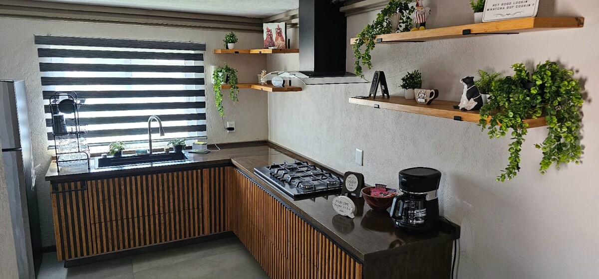 Relájate en este espacio tranquilo y elegante, ideal para pasar unos días de descanso. Con alberca privada climatizada ( 30 a 32 grados), relajante jardín, terraza abierta, cocineta y asador esta completamente equipada. Cuenta con 2 recamaras con un excelente diseño y preparadas para que disfrutes de un descanso placentero, con cama King en la principal y Queen en la segunda recamara ✔ Minisplit en ambas recamaras. ✔ Mini enfriador en recamara principal ✔ Internet en toda la casa de 500 Megas