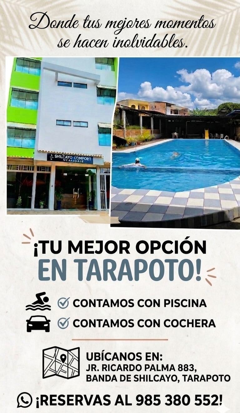 Մեր հյուրանոցը գտնվում է Տարապոտոյի կենտրոնում: Մենք ունենք Wi - Fi լայնաշերտ ինտերնետ, տաք սառը ջուր, համայնապատկերային պատշգամբով սենյակներ, աշխատասենյակներ, լսարան, շոգեբաղնիք, ռեստորան, մինի մարզասրահ, գրասենյակ, հագուստի խանութ և այն ամենը, ինչ անհրաժեշտ է ձեր հարմարավետության մեջ նախագծված շենքի ներսում ։ Բացի այդ, մենք կարող ենք ուղղորդել ձեր զբոսաշրջային փորձառությունը մեր տարածաշրջանում ՝ ունենալով անվտանգ և պատասխանատու տուրիստական գործակալություն: