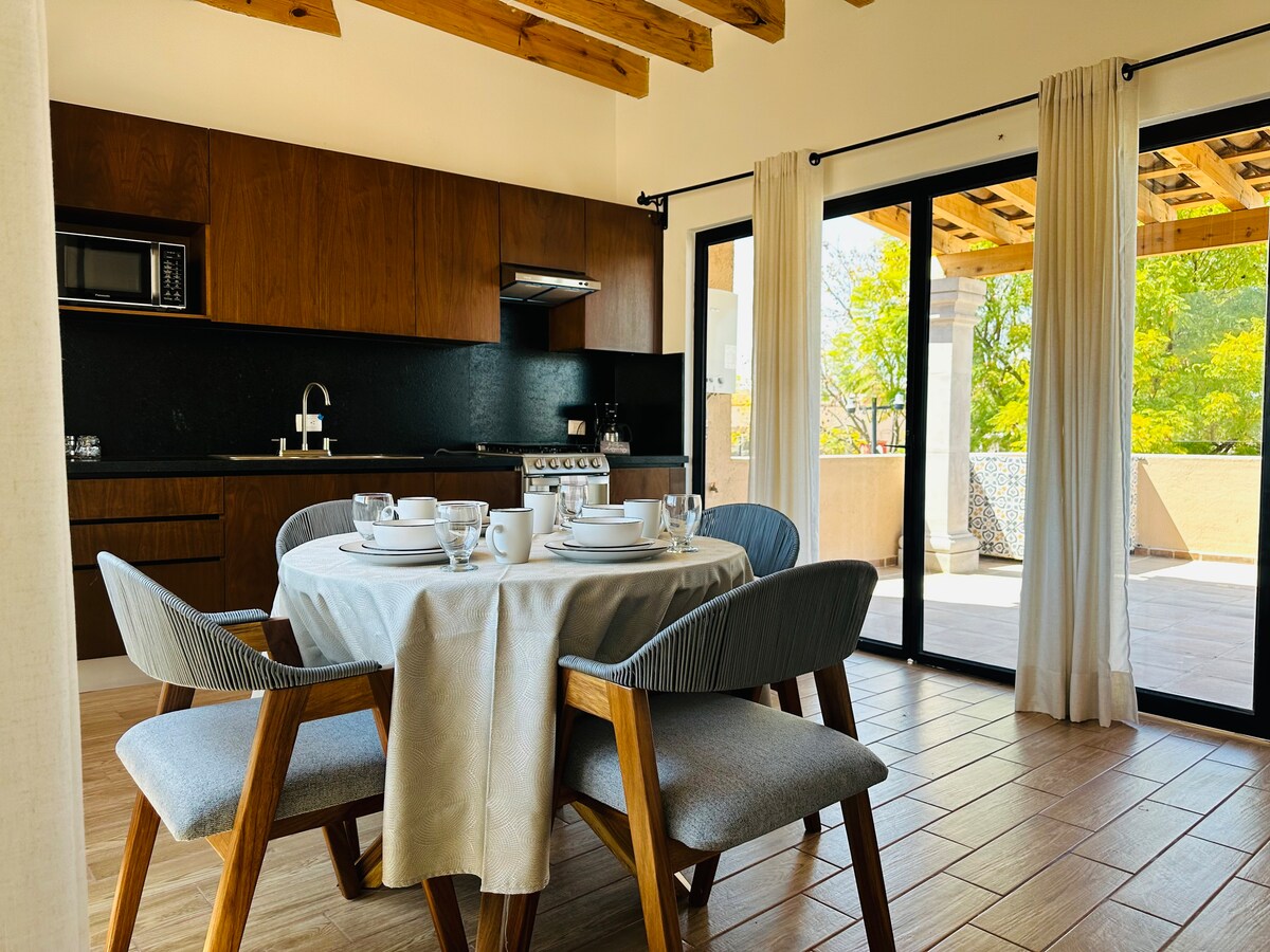 Loft con mucha luz y terraza integrada para aprovechar de los mejores atardeceres , es en un espacio con mucha luz y con todo el equipamiento necesario para disfrutar de una buena estancia en San Miguel de Allende. A 5 minutos caminando de la parroquia y del jardín.