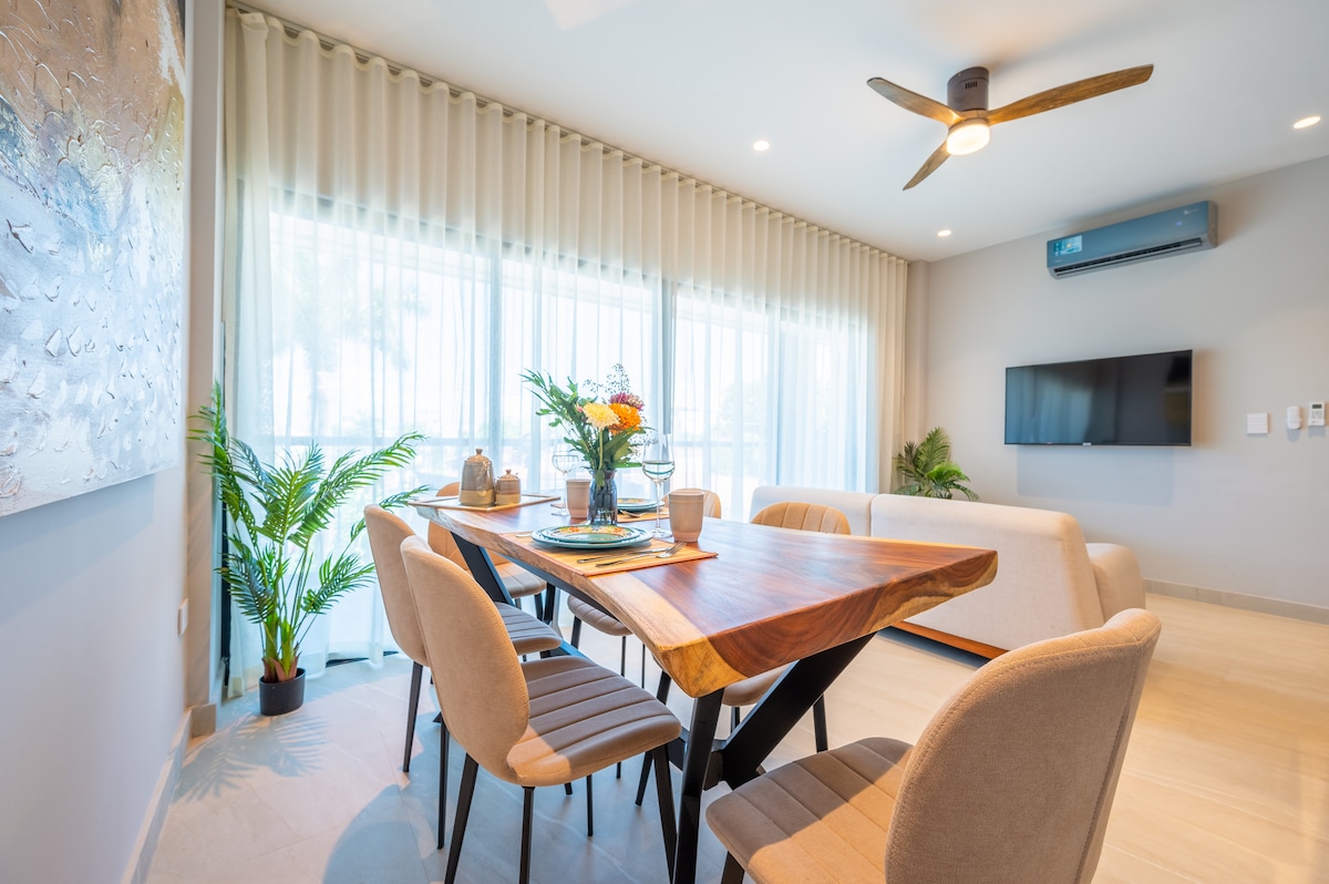 Escape to our luxurious 2-bedroom apartment in the heart of Cozumel! With stunning terraces, a modern living area, and high-quality amenities, this apartment is the perfect place to unwind and soak up the island's tranquility. Relax in front of the flat-screen TV, dine at the stylish six-person table, or prepare your own meals in the fully equipped kitchen. Our cozy bedrooms boast Queen-sized beds, private terraces, and luxurious linens for a peaceful night's sleep.
