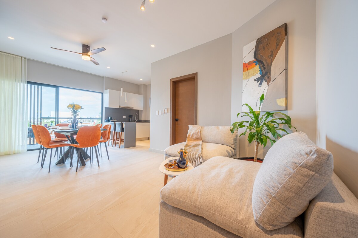 Welcome to our stunning 2 bedroom luxury apartment, located in the heart of Cozumel. Boasting two beautiful terraces, this apartment provides you with the perfect place to relax and enjoy the island's tranquil beauty. As soon as you step through the door, you will be greeted by a spacious and modern living area, beautifully decorated with stylish furnishings and an abundance of natural light. The living area is equipped with a large flat-screen TV, comfortable seating and a dining area for four