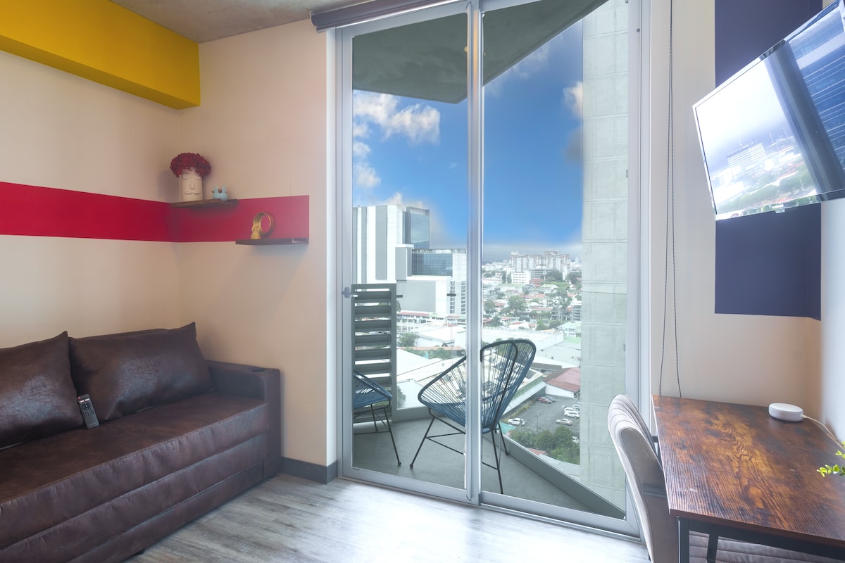Stylish apartment in the nicest neighborhood of San Jose. The loft is in a new luxury tower with more than 10 amenities (co-work spaces, semi-olympic pool, therapeutic pool, Jacuzzi on different floors, children's garden, two gyms, and several other spaces). Supermarkets, banks, restaurants, Sabana Metropolitan Park, National Stadium, are all located nearby. Great for medical tourism, business travelers, or anyone who wants to visit San Jose.