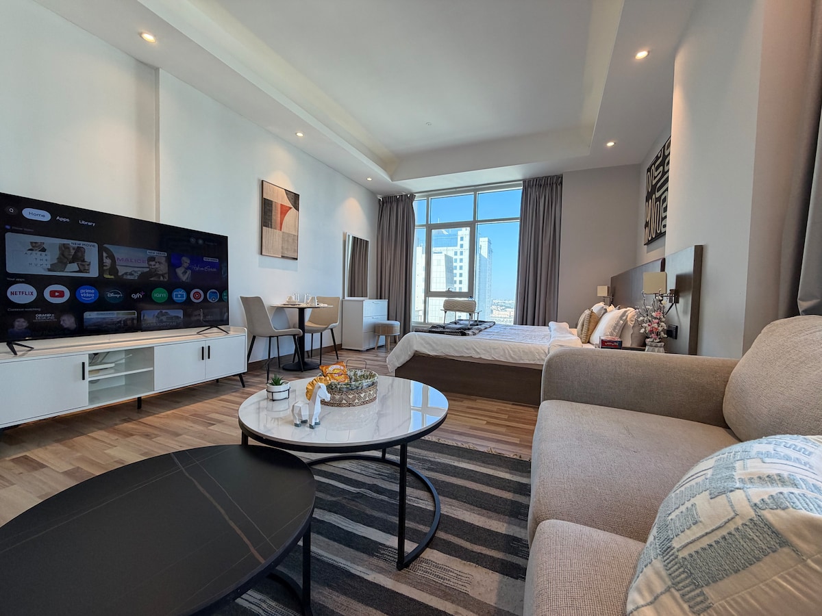 Experience modern comfort and breathtaking skyline views in this stylish one-bedroom apartment in the heart of Bahrain. Smoking is not allowed in the hall or bedroom u can smoke in balcony and loud music not allowed Designed with elegant neutral tones, warm lighting, and contemporary décor — Enjoy your morning coffee overlooking the city or unwind at night with stunning lights right from your balcony. Ideal for business travelers, couples, or weekend getaways.