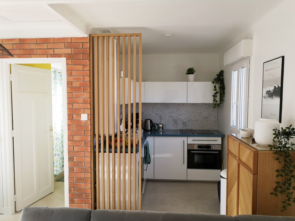 Գեղեցիկ բնակարան, որը գտնվում է Սանարի սյուր Մեր գյուղի ՝ Միջերկրածովյան փոքրիկ գյուղի սրտում, որը հայտնի է իր շուկայով, քվեարկել է Ֆրանսիայի ամենագեղեցիկ շուկան 2018 թվականին: Գտնվելով նավահանգստից և լողափերից մի փոքր հեռու ՝ դուք կիմանաք, թե ինչպես վայելել գեղեցիկ մայրամուտները: Հիանալի է ընտանիքների, զույգերի համար: Այն բաղկացած է 2 գեղեցիկ ննջասենյակից, մեկ ցնցուղասենյակից ։ Հասանելի են լավ այցի համար անհրաժեշտ բոլոր պարագաները ՝ օդորակիչ, անկողնային սպիտակեղեն և սրբիչներ, հեռուստացույց, Wi - Fi, սուրճի ապարատ