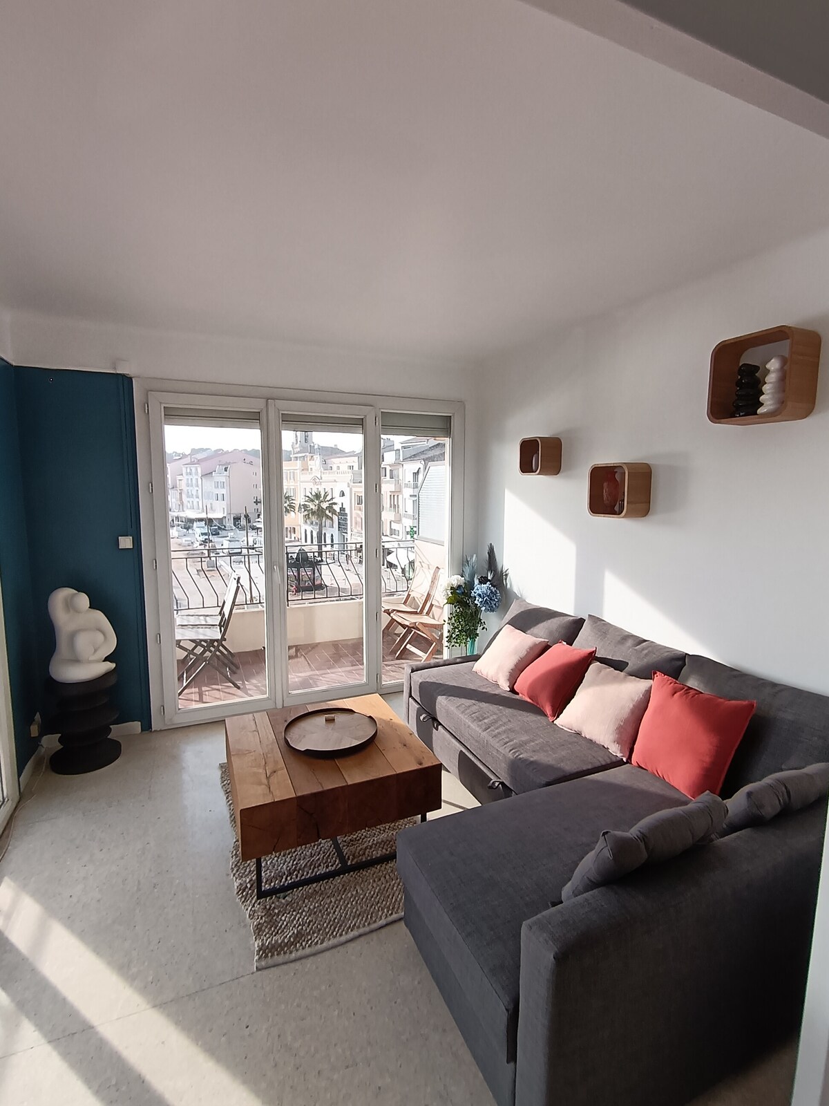 T2 de charme "étoilé" sur le Port de Sanary Appartement Exceptionnel refait à neuf, 1er étage ensoleillé et calme 51 m2 Prestations luxueuses, climatisation, TV, Wi-fi. Séjour, magnifique cuisine ouverte aménagée, équipée, dressing, grande chambre, salle de bains avec douche à l'italienne, W.C. Indépendant Appartement meublé et équipé pour 4 personnes avec 1 lit 160 x 200 + canapé convertible de très haute qualité. Literie neuve. Parkings à 3 minutes et plages à moins de 10 minutes à pied