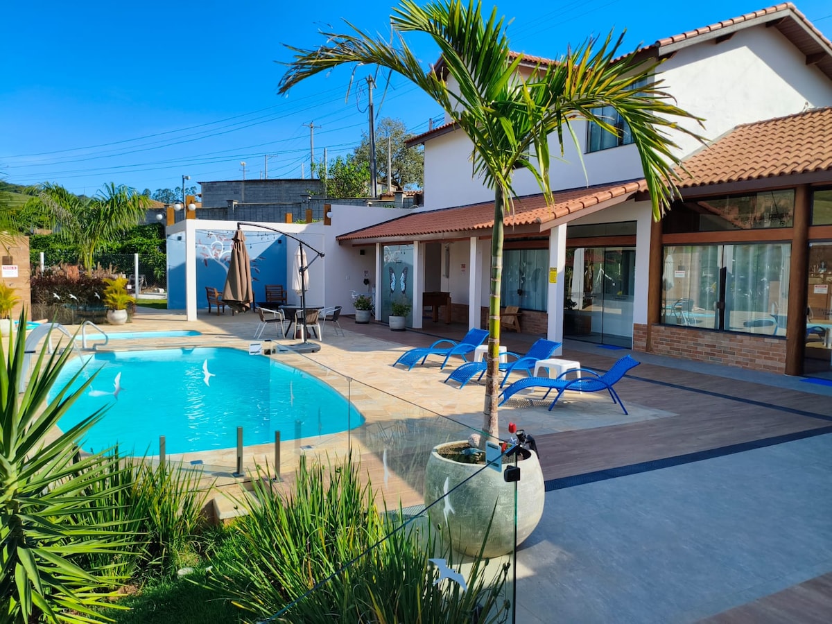 Casa em Guararema cercada por colinas que transformam o visual único e exclusivo para os visitantes. Espaço gramado em volta da piscina com redário para o seu descanso. Piscina em alvenaria, azulejada, com deck molhado e jacuzzi. Área Gourmet completa. A Casa possui todos os ambientes socias de tamanhos grandes. Aceitamos até 2 Pets de tamanho pequeno ou médio. Aqui você terá uma vista unica e privilegiada do Por do Sol 🌞 Venha vivenciar essa experiência Única no Recanto Alta Vista !