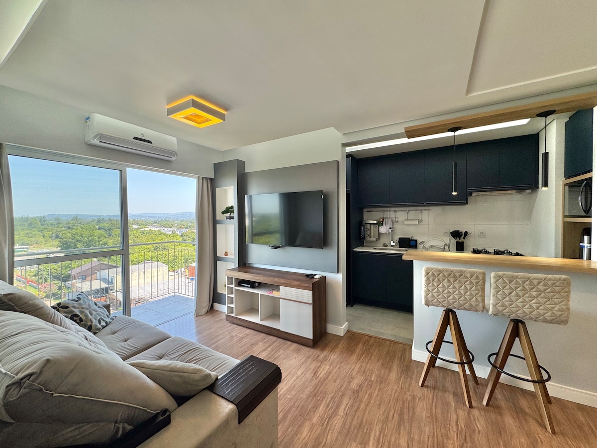 Apartamento novo, confortável, espaçoso, decorado, mobiliado e equipado, com garagem. Com ótima vista para Praça Central, Catedral, Parque da Cruz, Rua dos Desfiles, há 100 metros do parque da Oktoberfest. Cozinha completa, com churrasqueira, sala com smart tv, sofá cama, wi-fi, 2 quartos com camas de casal, 2 banheiros, sendo 1 suíte. Seja a trabalho ou lazer, o espaço é ideal para famílias, casais, executivos, turistas. Prezamos sempre pela qualidade em cada detalhe.