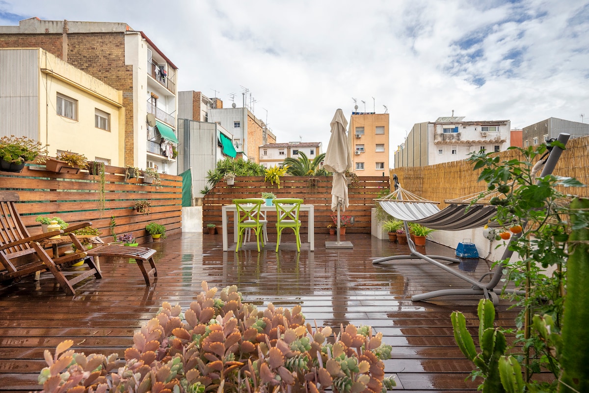 Encantador Loft d estil industrial boho a 15 min. caminant del Camp Nou. Molt ben comunicat amb tres linies de metro a 8 min. caminant. A 15 min. en metro de Rambles/Sagrada Familia/Diagonal/Gracia/aeroport. Llit de matrimoni, sofà, cuina totalment equipada. Bany complert. Gran terrassa assolejada a la coberta del edifici on relaxar-se i prendre el Sol, amb zona Chill out i Solarium. Roba de llit incl. Tasa turística inclosa. Entrada autònoma. Barri amb restaurants, cafés, ... Us encantarà!!