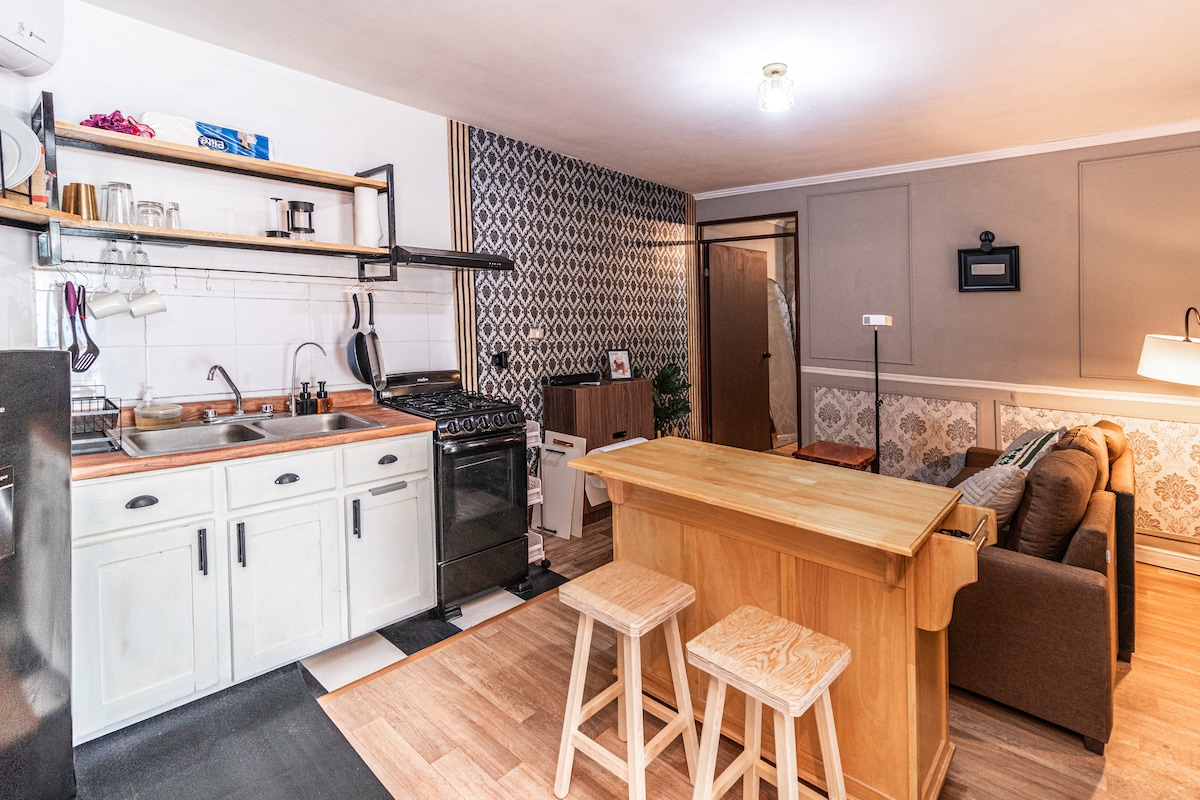 Բարի գալուստ մեր հարմարավետ վարչություն ՝ ռեստորաններից և խանութներից ոտքով հեռավորության վրա: Այս բնակարանը այն կատարյալ է զույգերի կամ հարմարավետ գիշերների համար, այն առանձին է և հարմարավետ է շարժական սարքից հանգստանալու կամ աշխատելու համար: Այն գտնվում է երկրորդ հարկում ՝ հեշտությամբ հասանելի ։