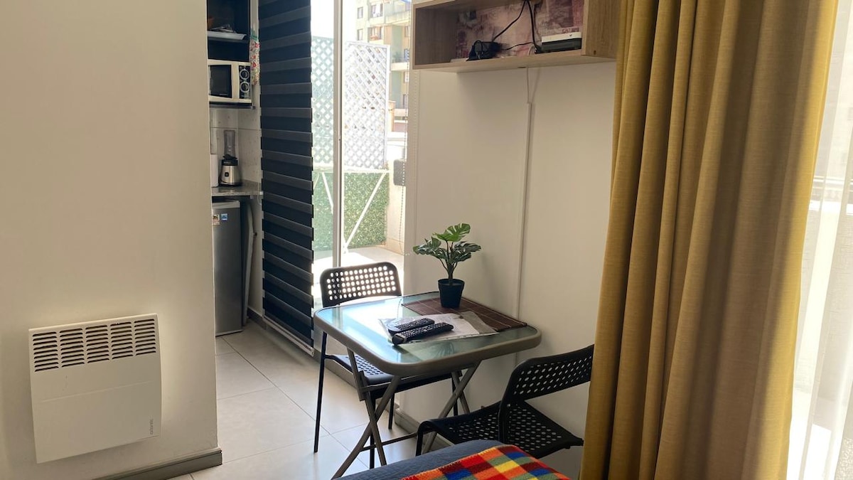 Bonito Home Studio, acogedor y cómodo, con todo lo necesario para una agradable estadía, ubicado en un tranquilo sector de Santiago. Cuenta con una terraza amplia donde uno puede realizar actividades diarias, si el clima lo permite. Cocina completamente equipada con artefactos eléctricos y termo para agua caliente. Excelente conectividad, cercano a dos estaciones de Metro y rodeado de un amplio y diverso comercio. Cuenta con internet Wi-Fi y TV cable.