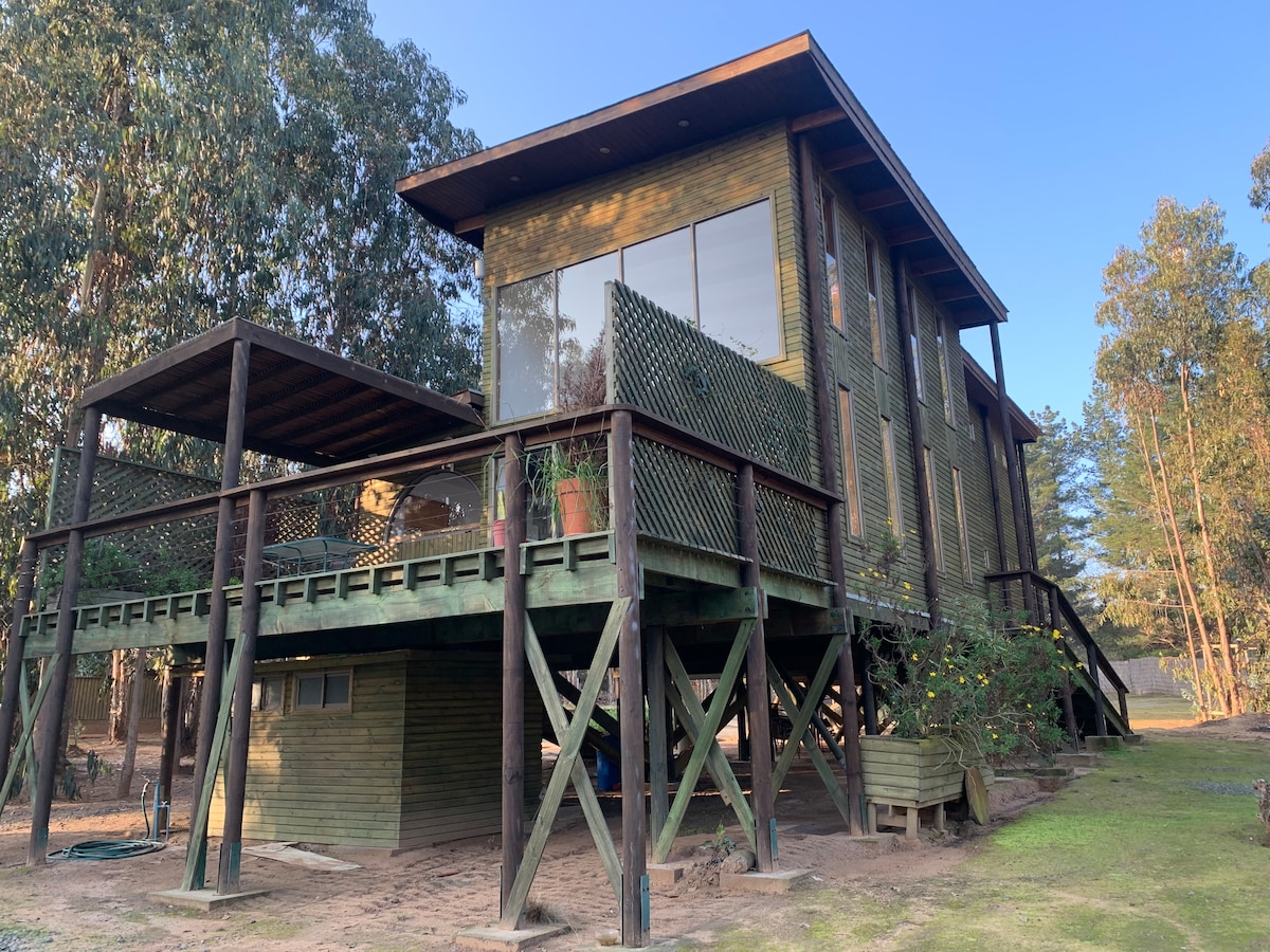 En Punta del Gallo, Tunquén, entre Quintay y Algarrobo, un espacio sustentable, de relajo y conexión con la naturaleza. Caminos de tierra, cercos de madera, 2 playas pequeñas a 2 min en auto, quebradas, pozones. Casa de madera, 72m2, doble altura, excelentes vistas y mucha luz. Una habitación king con vista al mar y otra con 3 camas 1 plaza (camarotes), ambas con estufas. Cocina, living y comedor conecta con terraza, parrilla asados, sillas playa y mesa plegable con bancas. Estufa Bosca a leña.