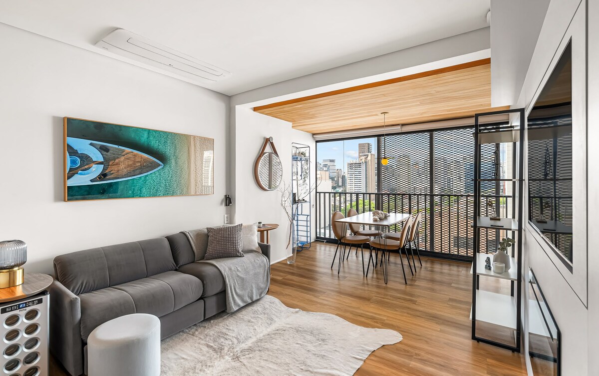 Flat de design assinado nos Jardins, a 2 quadras da Av. Paulista e 4 da Rua Oscar Freire. Ideal para quem valoriza conforto e localização estratégica. O apartamento oferece cozinha equipada, Wi-Fi de 500MB, garagem com manobrista e serviço de camareira em dias úteis já incluso. Acesso prático por código, sem uso de chaves. Perfeito para viagens a trabalho ou lazer, com a sensação de estar em casa e a praticidade de um hotel.